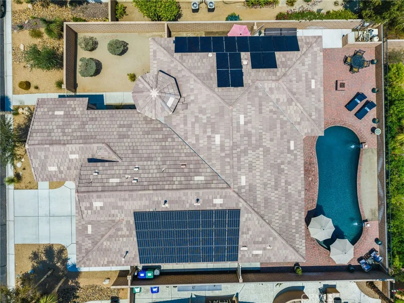 Located in the desirable community of The Gallery in Palm Desert, this Ponderosa built, 4 bedroom, 2.5 bath home offers 2,596 sq. ft. of stylish living space. A gated courtyard entry leads to an elegant rotunda, high windows, and 12 ft. tray ceilings that fill the home with light. The formal dining room is perfect for entertaining, while the kitchen boasts black granite counters, double ovens, and a Sub-Zero built-in refrigerator. The fourth bedroom is currently used as an office with a walk-in closet for added storage. The home is powered by 40 solar panels and a Tesla back up battery that are paid off. Enjoy resort-style outdoor living with a covered patio featuring recessed lighting and a mist system, plus a Pebble Tec pool with tanning shelf. The private backyard offers low-maintenance landscaping and stunning mountain views. Two attached garages accommodate three cars. This home blends elegance, comfort, and function in one of Palm Desert’s most sought-after neighborhoods.