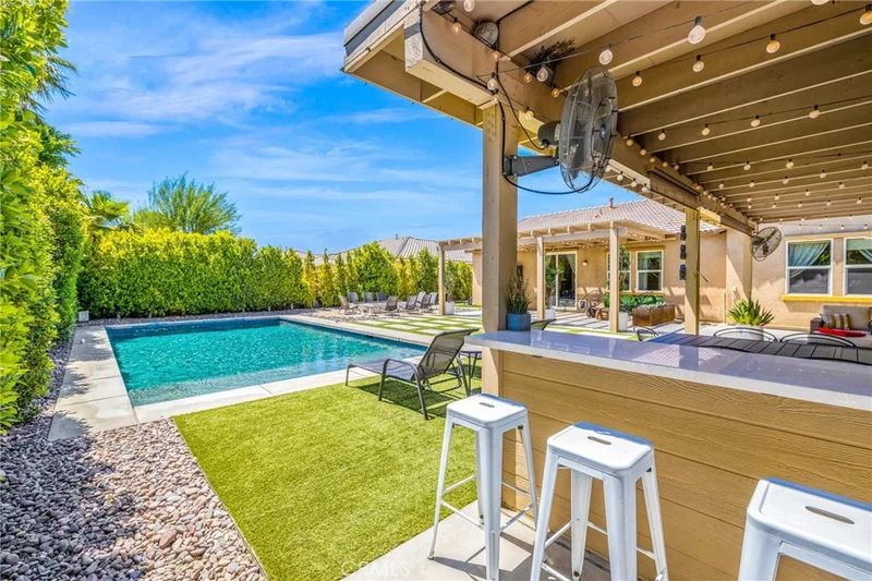 It feels like vacation with every amenity of home, step into the gorgeous backyard with a sparkling salt water pool and covered outdoor dining and entertaining space. Enjoy grilling by the pool and on those cooler desert nights the outdoor covered space includes mounted gas heaters or on the hot days a misting system, ready for those warm or cool desert nights. Well located in central Palm Desert only a few minutes of the 10 surrounded by world class golf courses and nearby shopping and dining at El Paseo. The garage includes an EV charging station for your electric vehicle. An open floorplan with custom designed chef's kitchen with plenty modern amenities. Walk-in pantry with wine rack wall, quartz countertops and full height backsplash. Custom built-in walnut and bronze glass dining table. Custom white oak modern built-in entertainment wall with wrap-around millwork with integrated primary bedroom interior door. Surround sound Sonos speakers in ceiling throughout main living area as well as out in the backyard. Porcelain wood grain flooring, new baseboards, new door casing, entire home recently painted. The casita includes a kitchenette and separate entrance with its own AC. Main home also has own AC unit as well as a newer mini split system in the garage, washer and dryer in home. The pool heat is on-demand, meaning we do not heat it when it's not in use or when no guests are staying. It heats up about 3 degrees per hour, and it can get down into the 60s during the winter, so if you want it heated upon your arrival, please keep that in mind and notify us. For long-term stays, $500 of gas and electricity is included, and the renter pays for utilities above $500/month. For short-term stays, the charge is $100/day if pool heating is paid upfront for every day of the stay or $125/day if not. Most resorts heat pools into the low 80's we allow guests that pay for pool heat to heat the pool to the mid-80s. Please keep in mind in mid-winter, larger pools will have a hard time even reaching the mid-80s, and pool temperature is not guaranteed. However, low to mid 80's is generally common, even mid-winter.