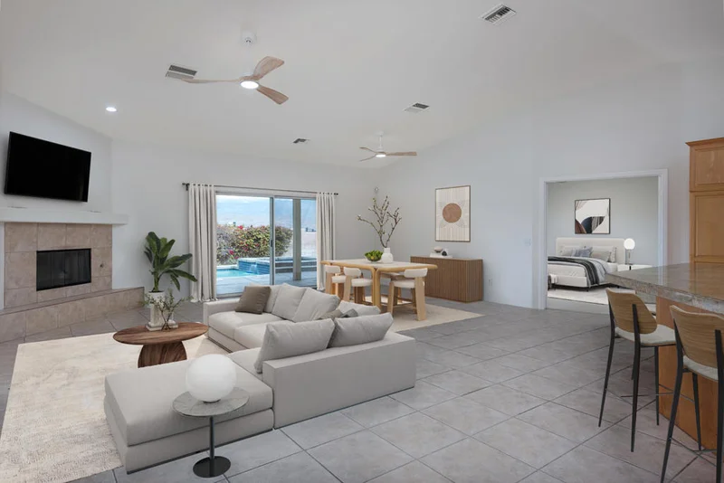 * 3BR/2BA detached Single Family Home with pano mountain views on fee land with no HOA* Open floor plan with vaulted ceiling living room/dining area, gas fireplace and direct access to a covered patio and gorgeous pool & spa; perfect for indoor/outdoor living and entertaining* Grand chef's kitchen with center island and 2nd sink and a 5-burner gas cooktop* Large primary bedroom, with direct access to the covered patio and pool deck, ensuite spa-like bath with soaking tub and separate shower and walk in closet* 2 additional excellent sized bedrooms* 2nd bath with shower over tub* Separate laundry room * Private yard with beautiful pool & spa and panoramic mountain views* Covered patio with recessed lighting and ceiling fans* Tiled floors throughout, brand new carpet in the bedrooms* New ceiling fans and new LED recessed lights throughout * Double paned windows throughout* 2-car side by side garage* Fantastic Palm Desert location close to freeways, schools, shopping center and renowned golf courses