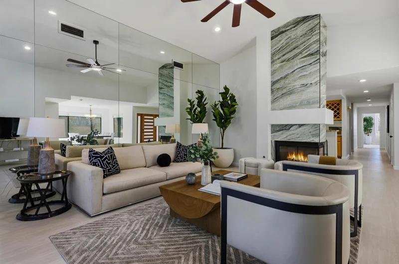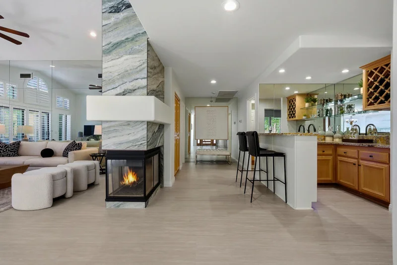 This stunning property is located in the coveted Avondale Golf Club and was recently transformed with tasteful upgrades throughout. As soon as you enter the stylish front door the striking multi-sided fireplace grabs your attention along with the walls of windows, dramatic ceilings and generous space. A neutral tile in all the common areas provides a welcoming warmth . The kitchen has a dinette that overlooks the pool and has plenty of counterspace with a removable island. The primary bath was reworked to create a lovely spa experience. This home is situated on the golf course, but still very private thanks to the lush landscaping and depth of the yard. The oversized pool feels like you're at a resort and there's plenty of space for lounging, bar-b-q and outdoor dining. Low HOA dues include social membership, sports courts, fitness and more.