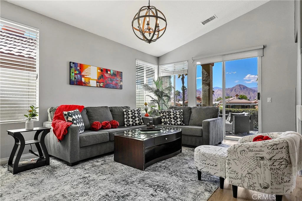 Beautifully positioned on the 4th hole within a guard-gated community, this fully furnished single-story residence offers exceptional mountain, golf course, and pond views. The home features a bright and open floor plan with large windows and sliding glass doors that provide natural light and direct access to the private patio, ideal for enjoying the surrounding scenery. The property is offered fully furnished and includes brand-new appliances throughout along with luxury vinyl flooring. The interior features 2 bedrooms and 2 bathrooms, a spacious living and dining area, high ceilings, and a three-sided fireplace. The primary suite includes an en-suite bathroom and walk-in closet. Additional features include an attached 2-car garage +golf cart garage space and a quiet cul-de-sac location. The outdoor patio overlooks the golf course and tranquil pond with panoramic mountain views beyond. Community amenities include pickleball, golf, country club, fitness center, meeting room, restaurant/bars, multiple pools and spas, greenbelts, and walking paths. Conveniently located near shopping, dining, golf, and the Indian Wells Tennis Garden.
