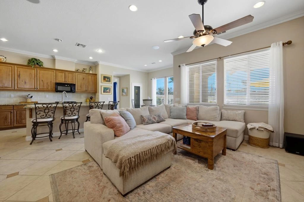 Welcome to Your Beautifully Upgraded Desert Retreat with gorgeous mountain views! Step into this bright and inviting home, thoughtfully enhanced with high-end upgrades and elegant finishes throughout. From the moment you enter, you'll notice the refined details--crown molding, stylish tile flooring, and a stunning granite slab kitchen designed for both beauty and functionality. The luxurious primary suite serves as a private sanctuary, featuring a travertine slab bathroom complete with a separate soaking tub and shower, along with a spacious walk-in closet to accommodate your lifestyle.This home is rich in convenience and comfort, offering a dedicated laundry room with built-in cabinets and sink, upgraded cabinetry throughout, a built-in vacuum system, surround sound, and recessed lighting with dimmers to set the perfect ambiance. Ceiling fans are installed in every room, while all bedrooms boast new luxury vinyl plank flooring for a fresh, modern feel. Additional highlights include a newer AC and heating system (installed July 2025), a walk-in pantry, soaring high ceilings, and a built-in alarm system for peace of mind. Offered partially furnished, the home is beautifully finished with elegant wood blinds and showcases breathtaking west-facing mountain views--perfect for enjoying stunning sunsets.Residents benefit from a low HOA, which includes access to a nearby community pool and spa, convenient guest parking, and a welcoming clubhouse just moments away.Palm Desert Country Club offers 18 holes and one of the best public courses here in the desert with its subtle greens, double fairways and mountain views. Palm Desert CC also has a modern club and bar with live music and fire-pit veranda.
