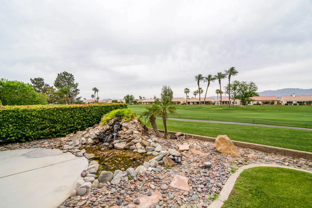 This is a fine fairway home in Sun City Palm Desert, a 55 plus community. This popular San Carlos home on 14th hole of the Mt Vista golf course, features 2 bedrooms and office/den, has a north facing patio with expansive views of golf course and mountains. the lovely, landscaped yard has a mature grapefruit tree and a cascading waterfall feature and a pond. The chef's kitchen is a delight with large granite countertops with a breakfast bar and lots of cabinet space. Other features include Plantation shutters in living room, family room, den, and kitchen, an Enviro water filtration system, tankless Water Heater, extended garage with epoxy flooring, large laundry room w a sink and cabinets and courtyard entry with water feature. Some furniture included outside of escrow. Come experience the best of desert living at Sun City with golf, pools, tennis, pickleball, fitness centers, dining with endless social activities within two state-of-the-art Community centers with concerts and numerous events!