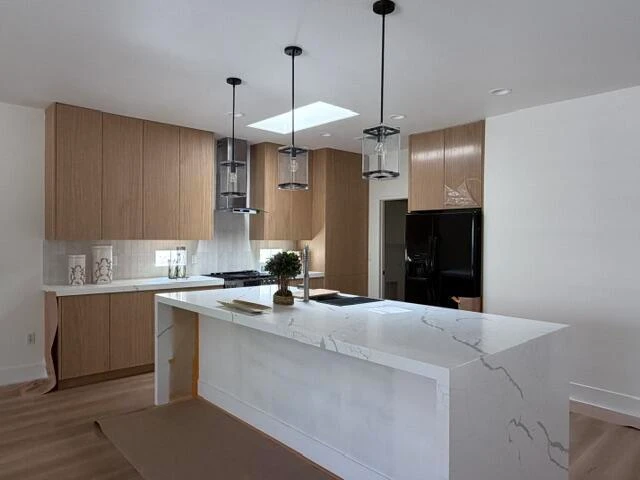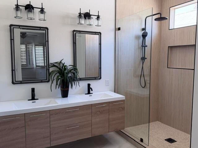 Sun City Palm Desert - St. Maarten. This beautifully remodeled and reimagined St. Maarten offers a fresh take on one of Sun City's most popular great room floorplans, blending modern design with everyday comfort. Inside, the home showcases luxury vinyl plank flooring throughout, complemented by large-format tile in the bathrooms, 6-inch baseboards, recessed lighting, plantation shutters, and fresh interior paint--creating a clean, cohesive, and move-in ready environment. The redesigned kitchen is a standout, featuring custom extended-length cabinetry, quartz countertops, a subway tile backsplash, and an expanded island with waterfall edges, breakfast bar seating, and stylish pendant lighting--perfect for both casual living and entertaining. Double doors open from the great room to a versatile den or office, offering flexibility for work or relaxation. The spacious primary suite features a bay window, a large walk-in closet, and a fully upgraded bathroom with a floating dual-sink vanity, custom-tiled stall shower with rimless glass enclosure, and designer fixtures, lighting, and mirrors. Guests are comfortably accommodated with a well-sized bedroom featuring a walk-in closet and a beautifully updated bathroom with a custom tile tub/shower surround, upgraded vanity, mirrors, and lighting. The north-facing rear yard provides a peaceful outdoor retreat with an extended patio surrounded by lush desert landscaping--ideal for enjoying the desert climate. Additional features include a laundry room with built-in storage and a two-car garage with an epoxy floor. This home delivers the perfect combination of thoughtful upgrades, modern style, and the vibrant Sun City Palm Desert lifestyle.