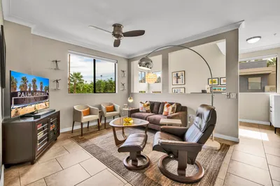 Welcome to Biltmore Colony, one of South Palm Springs' most desirable gated communities. This beautifully appointed 2-bedroom, 2-bath second-floor condo has been freshly painted and offers modern living with an attached one-car garage with direct access to the unit. The open-concept layout leads to an expansive outdoor space, ideal for entertaining, relaxing, or soaking up the desert sun while enjoying serene views. The community features three pools, two spas, a clubhouse, and a fitness center, with each pool offering outdoor cooking areas with grills and outdoor seating. Lush, beautifully maintained grounds complete the resort feel. Located just minutes from Koffi, Elmer's, and other Palm Springs dining and shopping destinations, this home offers the perfect blend of comfort, style, and location.