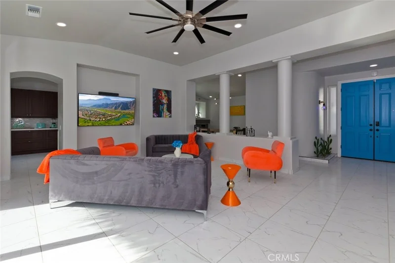 Welcome to a stunning gem nestled in the beautiful city of Palm Springs. This entertainer’s paradise is designed for ultimate enjoyment with its sparkling waterfall pool and an array of entertainment features. Recently renovated, this home boasts new windows, doors, lighting, two new AC units, a tankless water heater, a water softener system, and updated kitchen and bathrooms. Additional upgrades include new tile flooring and the latest smart home technology. Offering 5 bedrooms and 4 bathrooms on a spacious 11,761SqFt lot, this residence combines luxury and functionality. As you approach, you'll appreciate the expansive driveway and attached garage, which has been transformed into an impressive game room with a convertible billiards/ping pong table and a poker table. Inside, the home features high ceilings, recessed lighting, ceiling fans, and an open floor plan that enhances the sense of space. The large living area is perfect for hosting gatherings and opens directly to the backyard oasis. The dining room includes a cozy fireplace, adding warmth and charm to meals. The well-appointed kitchen boasts a central island, a bar area for guests, and ample cabinet space. The primary suite is a true retreat with a separate walk-in shower, a luxurious bathtub, a private toilet room, and double sinks. The additional bathrooms also feature walk-in showers. The backyard is a true entertainer’s dream, featuring a pool and spa with a cascading waterfall, three palapas, multiple seating areas, a mini golf course, a cornhole area, and a life-sized chess game. This home is a must-see for anyone seeking the ultimate in comfort and entertainment!