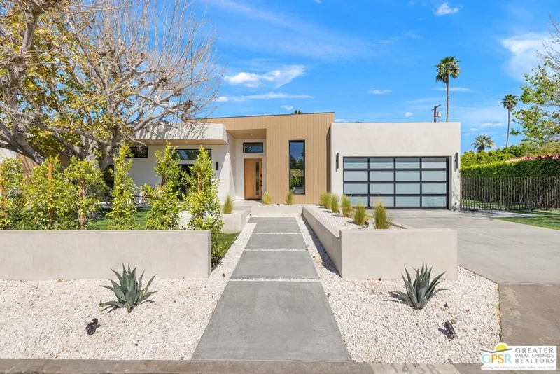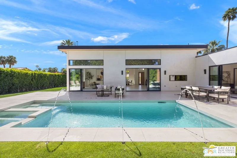 All new for 2026, this architecturally striking ultra-modern residence brings a bold contemporary presence to Palm Springs' desirable Movie Colony East neighborhood. Designed with clean lines, soaring ceilings, and walls of glass that frame the dramatic west-facing views of Mt. San Jacinto, the home offers approximately 2,500 square feet of refined indoor/outdoor living with four bedrooms and three-and-a-half baths. Set on fee land with no HOA, the property blends privacy with a prime location just minutes from the restaurants, galleries, and energy of downtown Palm Springs. Inside, porcelain tile flooring, sleek cabinetry, and refined modern finishes reinforce the home's minimalist design aesthetic. The open-concept living and dining areas flow seamlessly toward the outdoors, where multiple conversation spaces surround the newly built pool and spa, creating a true resort-style environment. At the heart of the home, the chef's kitchen centers around an oversized island and features KitchenAid appliances, smart lighting, and modern cabinetry designed for both everyday living and entertaining. The thoughtful layout provides excellent bedroom separation for privacy. The Primary Suite opens directly to the pool terrace through dual sliding doors and features a walk-in closet and spa-inspired bath with soaking tub and walk-in shower. Junior Ensuite Two enjoys views and its own private bath, while Bedrooms Three and Four capture mountain views and share convenient access to a beautifully appointed bath. A powder room serves guests. Modern comforts continue throughout with upgrades including a Sonos sound system, Grohe plumbing fixtures, Lutron lighting controls, and wireless-enabled pool equipment. A rare opportunity to enjoy brand-new modern architecture in one of Palm Springs' most sought-after neighborhoods where design, privacy, and mountain views converge.