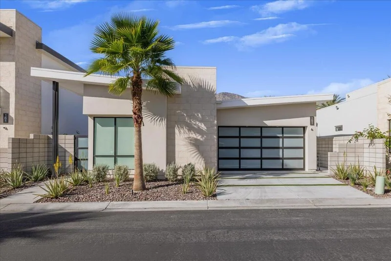 Iconic mid-century design meets modern luxury in The Vue, a gated enclave in the heart of central Palm Springs. Completed in 2023, this single-story architectural residence offers refined design, seamless indoor-outdoor living, and timeless desert appeal. The home's striking butterfly roof sets the tone, while an open-concept layout is flooded with natural light from expansive clerestory windows. Thoughtfully designed for both entertaining and everyday comfort, the residence features 2 spacious bedrooms, 2.5 bathrooms, and a versatile office/den.The chef's kitchen commands attention with premium Thermador appliances, quartz countertops, and a dramatic waterfall island, flowing effortlessly into the living area for a clean, contemporary aesthetic. Dual multi-slide glass doors open to a private backyard retreat with a covered patio ideal for dining and relaxation. A south-facing cocktail pool with Pebble Tec finish and three cascading waterfalls delivers a true resort-style experience, complemented by stunning views of the San Jacinto Mountains. Notable upgrades include built-in speakers with Sonos system, custom electric blinds throughout, a hardwired alarm system, and owned solar panels, blending luxury with energy efficiency. Just minutes from Palm Springs' top restaurants, shopping, and iconic hotels, this is a rare opportunity to own a nearly new architectural home in one of the city's most desirable locations.