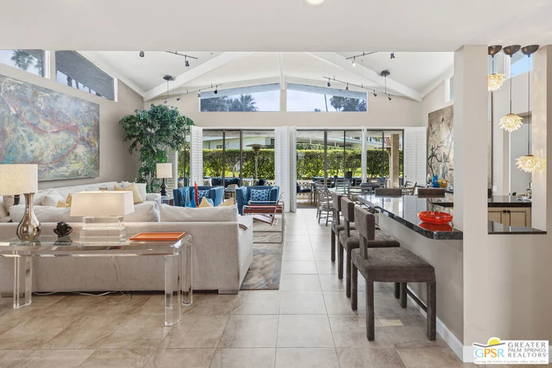 Mid-Century gem in the prestigious community of Canyon Estates, designed by Architect, Charles Du Bois. This 2600 Sq Ft detached condominium is a rare find in Palm Springs. Elegant clean lines, vaulted ceilings, generous light filled rooms, and clearstory floor to ceiling windows with mountain views make this cheerful home the perfect desert getaway.Beautiful details throughout include, ceramic tile flooring, plantation shutters, custom lighting, granite bar, built-ins, laundry area, finished two car garage and a covered patio that joins to all the main living areas. Large master suite features a walk-in closet, dressing area, and full master bath with a soaking tub, and shower. Two other guest bedrooms, one with en-suite bathroom and one is transformed into a den.Must see this wonderfully charming lifestyle home, amazing amenities included with the HOA fee include, Cable TV, Internet, Earthquake Insurance, ground maintenance, 9-hole, par-3 golf course, 15 community swimming pools, 12 spas, two championship tennis courts, pickleball courts, pool table, and a fitness center.