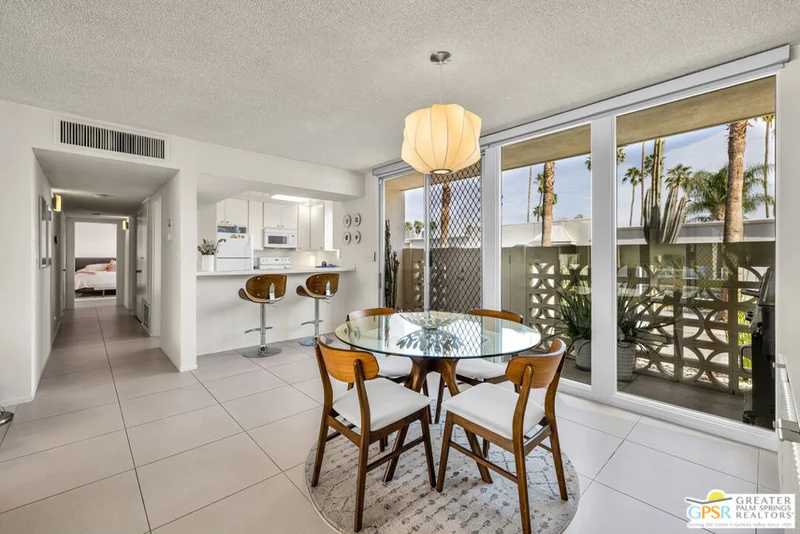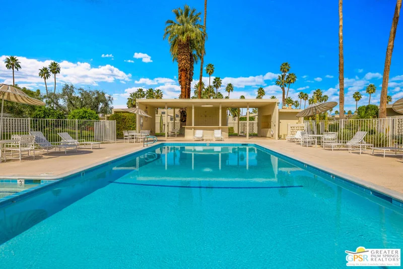 Iconic mid-century architecture. Spectacular mountain views. Historic distinction. Welcome to Sandcliff! Located within a designated Palm Springs Historic District, Sandcliff was recently added to the National Register of Historic Places, becoming the first multi-family development in Palm Springs to receive this recognition. This beautifully maintained home has been thoughtfully updated for desert modern living. Designed by architect Sherwin L. Barton and celebrated for its signature pinwheel layout, decorative concrete screen block, and walls of glass, Sandcliff represents one of Palm Springs' most architecturally significant mid-century garden apartment communities. This residence honors that legacy while incorporating meaningful modern enhancements. Sandcliff currently participates in The Mills Act, offering potential property tax advantages for eligible owners (subject to regulatory approval). Expansive living and dining areas open to private patios with impressive mountain views, creating seamless indoor-outdoor flow. Motorized roller shades throughout provide everyday convenience while preserving clean architectural lines. Dual-pane tempered glass upgrades in the living and dining areas enhance comfort and efficiency. Both bathrooms have been refreshed with updated fixtures and an interior laundry room a rare amenity in many mid-century communities adds everyday practicality. The original poured terrazzo primary patio has been enhanced with new drip irrigation lines, curated cactus and succulent plantings, landscape lighting on dusk-to-dawn timers, and a custom wrought iron gate, creating an inviting outdoor retreat. A convenient car port and private storage unit are located directly adjacent to the residence. Two heated pools and spas, walkable access to nearby shopping and dining, and breathtaking mountain views complete the experience. Experience Sandcliff: Authentic architecture. Thoughtful updates. Historic pedigree - the quintessential Palm Springs lifestyle as it was meant to be.