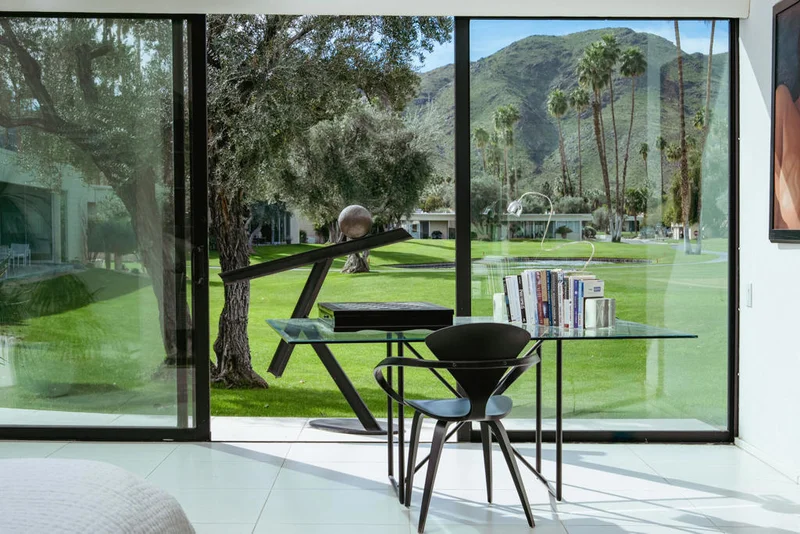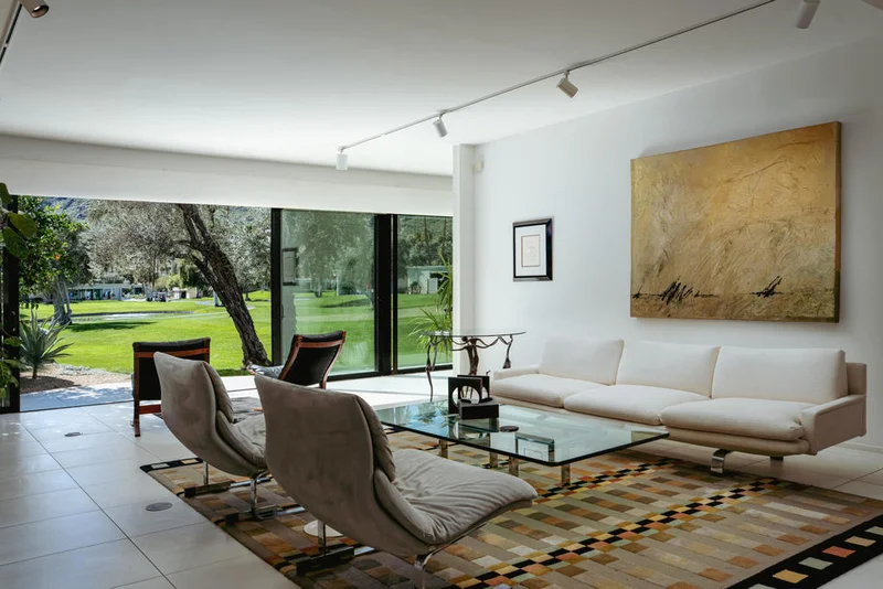 Presenting a distinguished Mid-Century Modern residence within the guard-gated enclave of Seven Lakes Golf & Country Club in Palm Springs. Originally designed by noted architect Richard Harrison, then expanded and thoughtfully enhanced by Architect, A William Hajjar to approximately 2,775 square feet, offering a refined interpretation of classic desert modernism. Positioned along the 16th green of the Ted Robinson-designed executive golf course, the residence captures sweeping southwestern views across the fairway, tranquil lake, and the dramatic mountain range beyond. Walls of glass invite abundant natural light, creating luminous interiors and providing generous gallery-style wall space ideally suited for a curated art collection. The floor plan features two well-proportioned bedrooms, two baths, and a versatile bonus workspace adaptable as a private office, studio, or creative retreat. A fireplace anchors the den area, lending warmth and architectural balance. The dining and well appointed kitchen areas open seamlessly to a private, hedge lined patio offering an intimate setting for outdoor dining and entertaining, embodying the essence of Palm Springs indoor/outdoor living. Seven Lakes offers an exceptional lifestyle with 15 pools and spas thoughtfully distributed throughout the community, as well as tennis and pickleball courts for active recreation. The iconic clubhouse, designed by renowned architect William Cody, serves as the social centerpiece, featuring an elegant dining room, vibrant lounge, and expansive outdoor terrace. This is a rare opportunity to acquire an architecturally significant home in one of Palm Springs' most celebrated Mid-Century Modern communities--where design pedigree, resort-caliber amenities, and panoramic desert vistas converge.