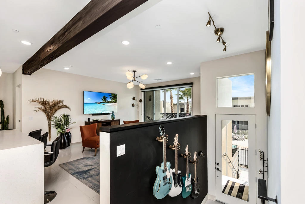 LONG TERM LEASE ONLY. Beautiful 2 bed 2 bath condo right in the center of Palm Springs! One of the best locations within the community, this upper level FULLY FURNISHED poolside condo is filled with custom details, including a cool Jetson style suspended fireplace, a wine fridge, custom gold hardware and tremendous mountain views to the south and west from every room and the balcony! Also includes full solar for super low electric bills. 64@The Riv is a gated community located in the Uptown Design District of Palm Springs, and close to tons of cool restaurants and shops. Some additional features are open concept living area, 9' ceilings with exposed beam, 8' tall sliders onto patio, clerestory windows, quartz countertops and backsplash, custom cabinetry, private community dog park, community electric car charging stations, and a 60' resort stye pool and fireside seating area. Small dog allowed upon approval and with a $500 deposit. Landlord pays gas, electric, water, and cable too!