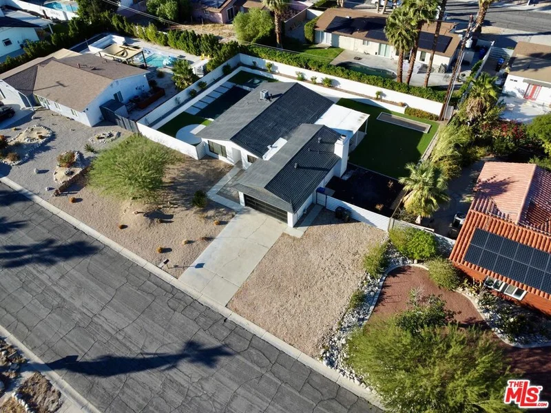 Searching for a desert retreat that felt like a work of art? In Palm Springs' coveted Desert Park Estates, this recently renovated 3-bedroom, 2-bath residence offers bold contemporary design, luxury finishes, and a resort-style backyard, all on a quarter-acre lot! Wrapped in smooth stucco, the home reveals a sleek open-concept interior where a golden-flaked floor-to-ceiling fireplace commands attention in the living room. The kitchen dazzles with Caf appliances and a one-of-a-kind backsplash that shifts color like a hologram in the abundant natural light. Both baths are magazine-worthy, featuring terrazzo tile, including in the primary suite's dramatic walk-in shower with gleaming gold accents. Outside, imagine teeing off on your personal putting green or cooling off in a brand new pool and spa, surrounded by freshly landscaped grounds and zero-maintenance turf. With a modern garage door, expansive covered patio, new HVAC, and custom tile flooring, every upgrade was made with intention. Located just minutes from downtown shops, dining, and I-10 access, this stunning showpiece invites you to live like every day is a vacation!