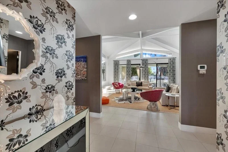 Canyon Estates is renowned internationally for its iconic Charles Du Bois Mid-Century Modern architecture, lush resort grounds and coveted lifestyle in Palm Springs. Enjoy all of this plus an ideal mix of upgrades and original features behind the private, gated entry at this fabulous single-level home, which spans approximately 1,998 square feet and shares only one wall with its neighbor. Double doors open to a formal entry and this floorplan's coveted living room. With its vaulted umbrella-style ceiling, clerestory windows, and two sets of sliding glass doors opening to a large covered patio, all RSVPs will be marked yes when you entertain in this incredible space. The living room flows directly to the dining room, where built-in seating and patio access embellish mealtime, parties and latenight snacking. Illuminated by a skylight, the kitchen reveals a pass-thru to the living room, ample cabinetry including a pantry, polished black countertops, a wet bar, and upgraded stainless steel appliances including a five-burner cooktop. The kitchen is joined by the dining room on one end and a laundry room and attached two-car garage on the other. Two bedrooms and two- and one-half baths make this home an ideal year-round residence or a lux vacation getaway. Both full baths shine with quartz countertops, frameless gloss-black cabinetry, frameless full-wall mirrors, and rain showers with custom tile surrounds. In the spacious primary suite, owners will appreciate direct patio access, a sit-down vanity and a separate soaking tub. Contemporary lighting, designer wallpaper, and an upscale blend of tile, carpet and plank flooring lend an enviable aesthetic. Homeowners enjoy country club-style living at Canyon Estates, where a MCM clubhouse anchored by a massive stone fireplace offers lake and mountain views, event space, a library, fully appointed fitness center and game room. Golf, tennis and pickleball are featured, and the community is convenient to shopping centers, restaurants, museums, nightclubs, hiking trails and Palm Springs International Airport.