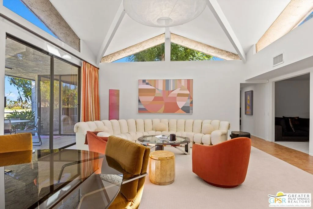 Here's your opportunity to own a piece of pedigreed mid-century history. Noted Palm Springs builder Roy Fey's last project, Mesquite Canyon Estates, offers an iconic William Krisel design reimagined and expanded by architect David Christian. The private enclave includes only 40 homes spaciously sited over 17 acres bordered by the 120-acre Prescott Preserve to the north. A luxurious yet relaxed lifestyle is enjoyed by the homeowners with three sparkling pools and spas to choose from, two tennis/pickleball courts, the new CV Link at the entrance to the community and endless recreational opportunities in the preserve. Homesites are designed to provide maximum privacy paired with bucolic and serene desert and mountain views from front and rear covered patios. Inside, this residence is one of only 14 in the community offering the famous open gable roof design which brings light streaming into the main living/dining area. Indoors and outdoors merge seamlessly with the wall of glass opening to the main patio, offering protected views across the community green belt and into the preserve beyond. The kitchen is open to the great room and includes a laundry center and a spacious south-facing breakfast area with sliders opening to a morning patio. An intimate den with fireplace provides more opportunity for conversation, contemplation and relaxation. The oversized primary suite is at the rear of the home, offering abundant sanctuary with access to the main patio, a walk-in closet, separate cedar closet, and ensuite with soaking tub and separate shower. The guest bedroom has eastern views to the tennis courts and also boasts a spacious walk-in closet. The second bath features a floor to ceiling privacy window which brings light streaming into the home. The garage may be one of the best bonuses - with more than enough room for two cars, a gym, abundant storage space, and an EV charger. Enviable location with easy access to everything one would want for a Palm Springs getaway. This one is a gem.