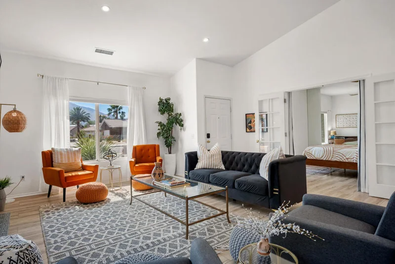 Best Deal in Palm Springs! Enjoy breathtaking west-facing mountain views from this beautifully appointed 4-bedroom, 2-bath home in the highly sought-after Flora Vista neighborhood. From the moment you enter, soaring ceilings, abundant natural light, and a cozy fireplace create a warm and inviting atmosphere ideal for both relaxing and entertaining. The spacious living room showcases stunning mountain views, providing a dramatic backdrop for everyday living. The remodeled, chef-inspired kitchen features modern appliances, sleek countertops, and custom cabinetry, opening seamlessly to a comfortable family room perfect for gatherings. The primary suite is a true retreat with high ceilings, dual-sink vanity, walk-in shower, and separate soaking tub--ideal for unwinding after a long day. Additional highlights include a dedicated laundry room with newer washer and dryer and direct access to the attached two-car garage. Step outside to your private backyard oasis, complete with a sparkling pool and spa and a covered patio ideal for outdoor dining or relaxing evenings under the desert sky. Perfect as a full-time residence, desert getaway, or investment property, this home delivers comfort, style, and exceptional value. Don't miss the opportunity to make it yours!