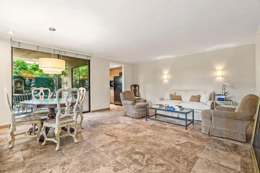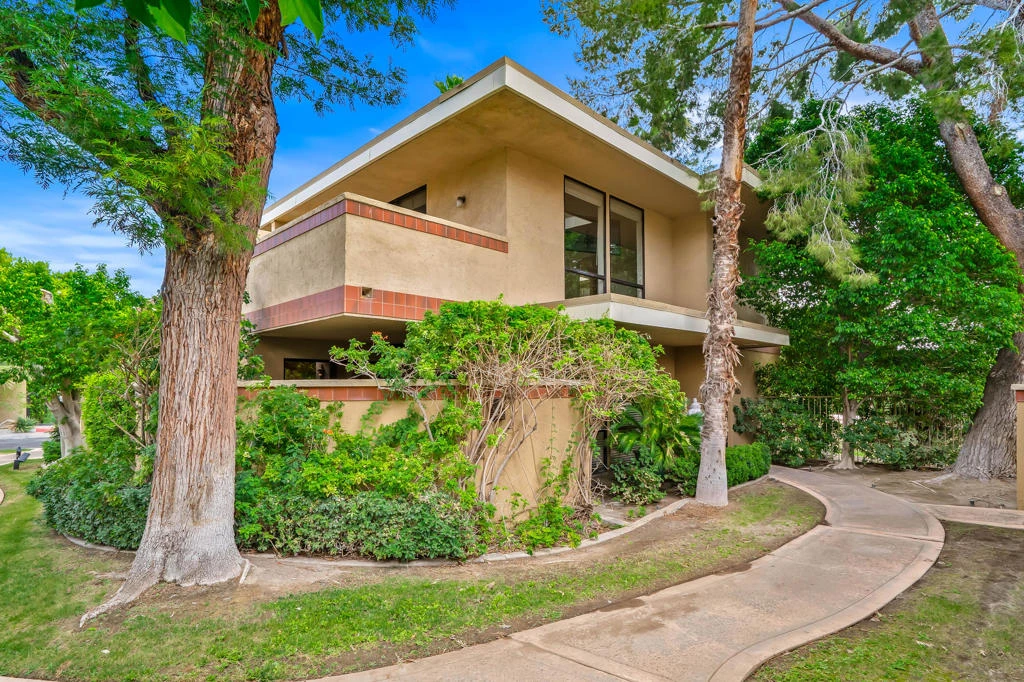 A rare opportunity to own a two-story, townhouse-style residence at the Historic Racquet Club Colony--one of only 20 exclusive villas, with just 10 two-story homes that seldom come to market. This exceptional approximately 1,500 sq ft home is elegant, dramatic, and truly one of a kind. Soaring vaulted ceilings, oversized rooms, and walls of glass create a striking presence while delivering seamless indoor-outdoor living--ideal as a full-time residence or sophisticated Palm Springs retreat. A welcoming entry foyer leads to a versatile 2nd bedroom/guest suite with full ensuite bath--perfect as a home office or creative space. The main living/dining areas feature travertine tile flooring and recessed lighting. The updated kitchen showcases natural wood shaker cabinetry, rich dark granite countertops, a gray mirrored backsplash, stainless steel appliances, deep under mount sink, and a built-in flat screen TV. Glass sliders open to a private, walled front patio offering European charm and romance, complete with a lion head fountain and faux boxwood walls--perfect for entertaining or relaxed desert living.The 2nd level primary suite is a true retreat. A charming natural light-filled nook off the staircase provides space for a desk or reading area, while the expansive bedroom features dramatic 12' vaulted ceilings and ''treehouse'' panoramic mountain views through floor-to-ceiling windows. Sliders open to a generous private second-story terrace, extending the living experience outdoors. The ensuite bath features a dressing area with a large mirrored double closet and a spacious layout. In-unit laundry, walk-in closets, and additional storage throughout--including under-stair space--add everyday convenience. Custom wood blinds, thoughtful upgrades, and abundant storage enhance comfort and livability throughout this distinctive residence. Set within lush, gated, fee-simple grounds, Racquet Club Colony offers a serene, resort-style environment with pool, spa, and cascading waterfall fountain surrounded by mature landscaping. Covered parking, ample guest parking, and a pet-friendly setting with a dedicated dog run complete the community. Ideally located minutes from shopping, dining, and fitness, and just 10 minutes to vibrant downtown Palm Springs--this is a compelling opportunity to own a dramatic, architecturally unique residence in one of the city's most exclusive enclaves.