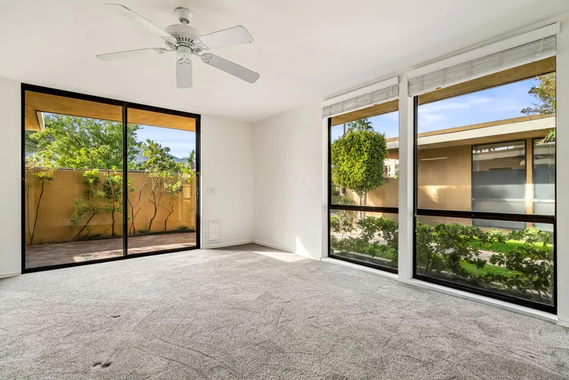Own a rare townhouse-style residence at the Historic Racquet Club Colony--one of only 20 exclusive villas and the final addition to the famed Racquet Club, built by the Hotel Del Coronado Corporation. This exceptional 1,100 sq ft single-story home features dramatic vaulted ceilings, oversized rooms, and seamless indoor-outdoor living, making it an ideal full-time residence or refined weekend retreat. The expansive living room is defined by its soaring cathedral ceiling and slate tile flooring that extends throughout the main living areas, creating a clean, modern aesthetic. Walls of glass open to a private walled front patio, perfect for relaxing or entertaining. The oversized primary suite offers newer high-end carpet for comfort and warmth, along with an ensuite bath featuring double vanities, walk-in shower, skylight, and direct access to a second private patio with breathtaking San Jacinto Mountain views. A versatile bonus room with skylight and full ensuite bath provides flexibility as a guest suite, home office, or creative space. The kitchen is beautifully appointed with stainless steel appliances and granite countertops, blending timeless design with everyday functionality. In-unit laundry, newer HVAC, and thoughtful upgrades throughout enhance comfort and efficiency. Set within lush, gated grounds on fee-simple land, Racquet Club Colony offers a private resort-style setting with a sparkling pool, spa, and cascading waterfall fountain surrounded by mature landscaping. Covered parking and abundant guest parking provide convenience, while the pet-friendly community includes a dedicated dog run. Ideally located just minutes from Albertsons, Steel Gym, Starbucks, and only 10 minutes to downtown Palm Springs' vibrant dining, museums, boutiques, and nightlife, this residence combines historic pedigree, architectural drama, and modern livability in one of Palm Springs' most sought-after and exclusive enclaves.