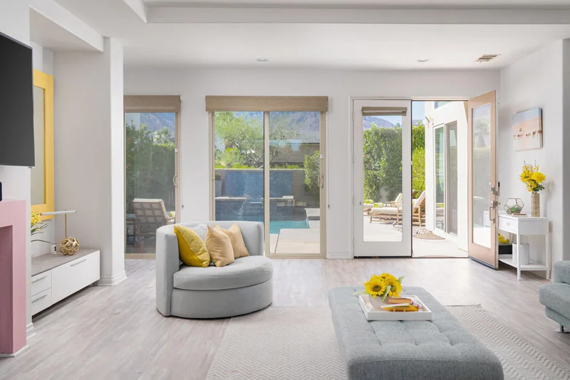 Nestled in the heart of Palm Springs on fee land, 2684 Isabella embodies the essence of desert living. Spanning 3,056 square feet, this four-bedroom, four and one half bath residence seamlessly blends contemporary architecture with the desert's beauty. The home's sleek, front-loaded design makes a bold impression, with a modern floor plan that optimizes indoor-outdoor living and tremendous mountain views. Inside a bright, open floor plan is flooded with natural light through expansive walls of glass on both sides of the enormous great room. High ceilings enhance the volume and space in every room. The main living area flows effortlessly between kitchen, dining, two full living areas - ideal for both everyday comfort and entertaining. The gourmet kitchen serves as the heart of the home, featuring an oversized island and tons of storage, including a walk-in pantry perfect for gatherings with friends and family.The primary suite features direct outdoor access, a full living area, huge walk-in closet, and a resort-like bath with a soaking tub and glass-enclosed shower. Two guest bedrooms are en suite and open to the outdoor living areas.Outdoor living is where this home shines - The west-facing front yard provides a spectacular setting to enjoy the desert sunsets, complete with lounge areas, a sparkling pool, and plenty of open space for relaxation and entertaining. Enclave at Sunrise is a small collection of desert modern homes that are moments from all that Palm Springs has to offer in shopping, dining, entertainment and architecture.