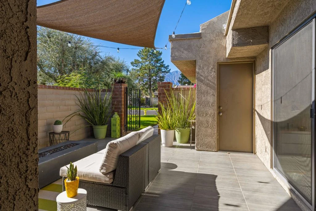 FURNISHED!! Welcome to South Palm Springs' West Gate Community of Cathedral Canyon Country Club and discover this gorgeous remodeled single-level, 2-bedroom, 2-bathroom condo being sold turnkey, fully furnished (per inventory). Have morning coffee on the patio outside the primary bedroom or living room, enjoying views that include mountains, golf course, and a serene pond with wildlife. The spacious, open living area features vaulted ceilings and offers an abundance of natural light throughout. The kitchen has quartz countertops, stainless steel appliances, wine refrigerator, ample counter space, and sliding door access to a front patio for lounging at a fire pit and enjoying lovely western mountain views. There is updated hardwood laminate flooring throughout the home (except for tiled bathrooms). The two bedrooms are separated by a lovely, light-filled atrium. The primary bedroom showcases amazing views of golf course greenery, and the updated ensuite bathroom (with dual vanities & quartz countertops & tiled shower) has sliding door access to the atrium. The guest room at the front of the condo is adjacent to the second bathroom and has sliding door access to front outdoor patio. The condo is steps away from one of the community pools. A 2-car garage offers plenty of space for storage. West Gate is an incredible social community where residents enjoy resort-style amenities, including 14 pools/spas, 10 tennis courts, and access to an 18-hole golf course. This condo's outstanding location is close to downtown Palm Springs, Rancho Mirage, and 12-15 minutes from the fine dining and shopping of El Paseo in Palm Desert. Whether you're looking for full-time residence or a second home to enjoy at your leisure, don't miss this beautiful condo with the perfect blend of modern elegance and resort-style living, in the perfect south Palm Springs location!