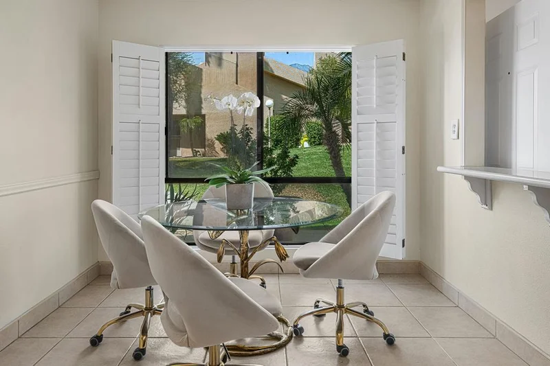 YOU OWN THE LAND(NO LAND LEASE)!!!! Welcome to The Pointe, a beautiful community with magnificent grounds surrounded by mountain views. A boutique retreat in the coveted Los Compadres neighborhood of South Palm Springs. This end unit is like a private single-family home with two large bedrooms, walk-in primary closet, dining area, separate laundry room/office, a private patio, plus an ATTACHED TWO CAR GARAGE with an abundance of storage cabinets and a Tesla Wall Charger. Step inside to enjoy this light and bright condo with a vaulted ceiling. The open concept offers a fantastic space to relax or gather with friends and family. Enjoy the cozy fireplace inside the freshly painted family room. All three sides of this end unit provide mountain views from the family room, dining room, and both large bedrooms. The windows are perfectly accented with plantation shutters. The spacious laundry room is conveniently located and offers ample space for a home office or den. The kitchen countertops and backsplash have been updated with Concretta FS, along with a new wine refrigerator. Step outside with privacy to unwind in your enclosed and secluded patio that allows for an option to lower the lush Ficus hedge for unobstructed mountain views. The main electrical panel, the AC unit, and the water heater have been updated a few years ago. The HOA includes the Roof, Earthquake Insurance, Built in Fire Sprinkler System, Exterior Paint, Trash, Exterior Exterminator, Gated Community, Common Area Grounds, Tennis Courts, Pickleball Courts, HUGE swimming pool and in-ground spa. Impressive long driveway was redone with high quality pavers and plenty of guest parking. Walking distance to Smoketree Shopping Center, grocery stores and restaurants. Quiet Community, Wonderful Condo, Perfect Location. Welcome to your new home!