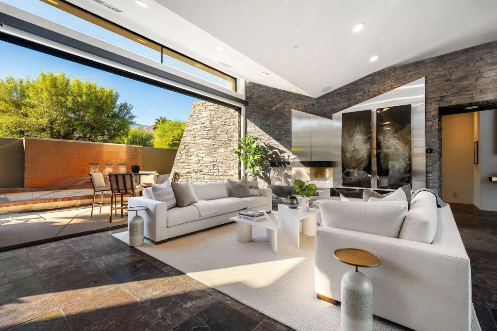 A masterwork by award-winning architect Narendra Patel, this residence is one of the most significant offerings within the gated enclave of Alta in South Palm Springs. With bold modernist lines, dramatic volumes, and expansive walls of glass, the home is designed to frame sweeping views of the San Jacinto Mountains while preserving a sense of complete privacy.Interiors flow effortlessly between the spectacular great room, wet bar, formal dining area, and chef's kitchen--each space oriented to blur the boundaries between indoors and out. The primary suite is a private sanctuary with fireplace, sitting area, spa-caliber bath, and direct pool access. Attached casita with kitchenette and private entrance offers flexibility for guests. Sculptural water features, fountains, curated landscaping, and multiple terraces encircle the resort-style pool and spa, creating a setting that is both serene and dramatic. Rarely does a property so seamlessly combine architectural pedigree, privacy, and the essence of Palm Springs modern luxury. Exceptional offering.