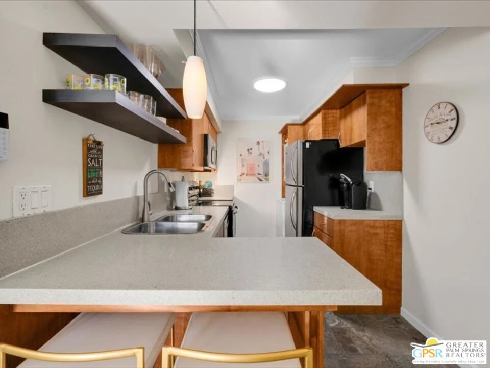 Welcome to your perfect Palm Springs getaway. This stylish one-bedroom condo puts you right in the heart of it all, just minutes from the restaurants, shops, and energy of Palm Canyon Drive, yet tucked away in a peaceful, gated community. Inside, the home has been thoughtfully updated with sleek slate flooring, a modern kitchen and bath, and a spacious walk-in tiled shower. Recessed lighting and in-unit laundry add comfort and convenience, while extra bedroom storage makes everyday living easy. Step outside and you'll find not one, but two private patios ideal for morning coffee, evening cocktails, or weekend BBQs under the desert sky. Offered fully furnished, this move-in ready condo also includes access to resort-style amenities: two sparkling pools, hot tubs, and tennis courts.Whether you're here for a season or something longer, this is effortless Palm Springs living at its best.