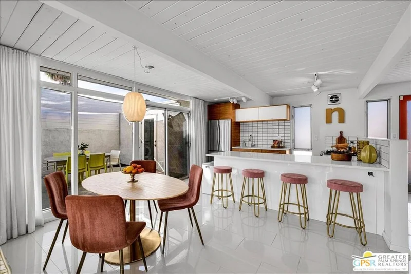 A "Palmer & Krisel" Original. Nestled in the historic and iconic Racquet Club Estates, this Mid-Century stunner designed by Palmer & Krisel and built by Alexander Construction Co. perfectly captures the innovative spirit of desert modernism. This neighborhood is a true reminder of the importance of design, famous for its five distinct rooflines and architectural pedigree highlighted by open floor plans, atriums, and breezeways. Inside, the signature post-and-beam construction is flooded with California sunshine via breathtaking walls of glass and strategically placed clerestory windows that frame the incredible San Jacinto mountain views. While retaining its 1959 soul, this residence has been meticulously updated for the 21st century to blend vintage charm with modern luxury. The unique, restored floating iron and tile fireplace serves as a stunning focal point for cool desert nights, complemented by glossy tile floors. The kitchen features Caesarstone counters, custom cabinetry, and sleek stainless steel appliances. Even the bathrooms have been thoughtfully coordinated with modern mosaic accent tiles that feel authentically Palm Springs. Practical updates like OWNED solar, an EV charger in the garage, updated plumbing, and dual-pane windows ensure this classic home functions with contemporary efficiency. Designed for the quintessential indoor-outdoor living experience, the spacious south-facing backyard is a private resort and the ultimate Palm Springs lifestyle. A gorgeous swimming pool invites you to float for hours, while a jetted spa helps you de-stress under the starry desert nights. The outdoor space is an entertainer's dream, featuring a custom sunshade canopy and a covered patio defined by a vibrant artist-curated mural. Whether you're sipping cocktails by the mural wall or rinsing off in the tiled outdoor shower, every inch is framed by beautiful landscaping and striking views. Located just blocks from the chic downtown area and all things cool Palm Springs has to offer. This home is a magnet for architecture fans seeking a sophisticated second home or a full-time residence. Welcome to Racquet Club Estates, stop dreaming and start living the life you've always imagined.
