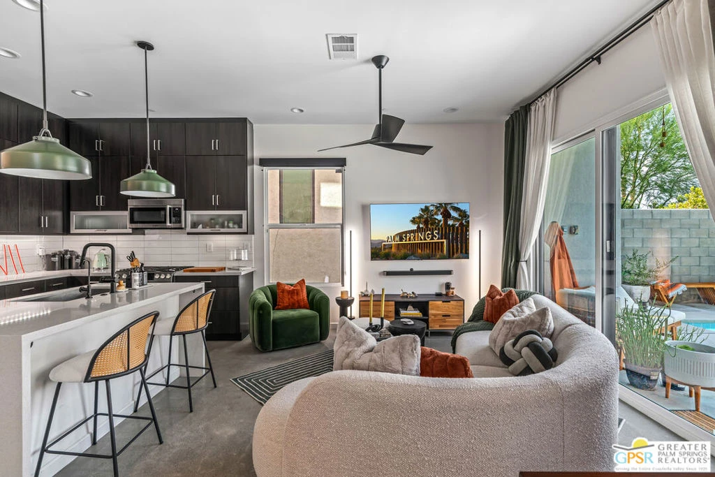 Prime location in Palm Springs, ideal for full-time living or seasonal use, at ICON, a gated community of homes on Fee Land (no Lease) . PRIVATE pool and spa, 2 beds, den/office, 3 baths, attached 2 car garage with direct access. Open-concept kitchen centered around an island, polished concrete floors throughout. Soaring 10-ft ceilings lend a spacious, modern look and feel. Second floor/upstairs bedrooms are dual suites, with 9-ft ceilings, each suite features walk-in closets and private balconies with views. Upstairs utility/laundry room equipped with a utility sink. Interior upgrades: custom window treatments throughout, designer lighting: sconces/chandeliers/pendants/recessed throughout.. Equipped with owned solar panels, built with radiant barrier roofing, enhanced attic/ wall insulation, and dual-glazed Low-E windows. Tankless water heater, drought tolerant landscape with drip irrigation and custom exterior lightning. Energy-efficient heating/cooling systems, ceiling fans. Additional comfort upgrades: whole-house water softener, reverse-osmosis system at the kitchen faucet, security system. Epoxy finished garage floor. All on fee land (no lease) with low HOA fees. Move in ready!