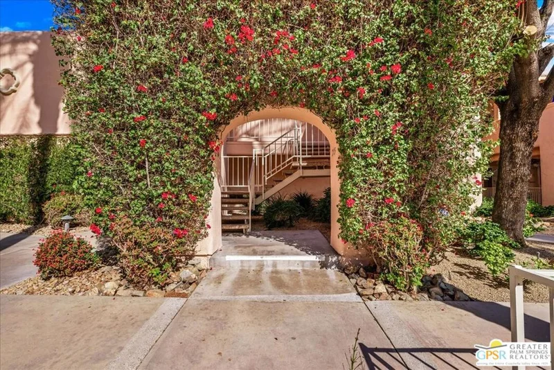 Experience classic Palm Springs living at The Deauville, just moments from the restaurants, shops, and nightlife of vibrant downtown. Designed by renowned desert modernist Hugh Kaptur, this upper-level furnished residence blends iconic architecture with effortless comfort. Soaring vaulted ceilings and clerestory windows invite beautiful natural light into the open living and dining spaces, creating an airy desert retreat. Sliding doors from both the living room and the spacious ensuite bedroom lead to a private patio with stunning mountain views. The flexible one-bedroom, two-bath layout makes hosting easy and enhances rental appeal. Perfect as a seasonal getaway or income-producing property, this community allows 14-day minimum rentals. Additional features include an in-unit washer and dryer as well as rare underground parking that accommodates up to three vehicles and offers extra space for bikes and gear. Residents enjoy resort-style amenities including three pools and spas, tennis courts, a fitness center, and a clubhouse all set within beautifully maintained grounds.