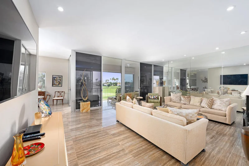 NON-OBSTRUCTIVE GOLF COURSE VIEWS!! This private, renovated, top-floor 2 bedroom/2 bath home is located in the Seven Lakes Golf and Country Club--also known as the ''Gem of the Desert''-- & is positioned above the HISTORIC 13th green where in 1968 President Eisenhower sank his only hole-in-one. Enjoy peaceful, quiet, non-obstructive views of the golf course and one of the seven lakes within the community. Play 18 holes of golf on the Ted Robinson designed golf course or socialize in the William Cody designed club house where dignitaries and Hollywood royalty have mingled for decades. Entering the home reveals 10 ft high ceilings and designer tile flooring. The extended terrace opens to a spacious living and dining area that is ideal for entertaining.Enjoy sunrises, sunsets and stunning 180-degree views of the San Jacinto and San Bernardino Mountains. The main bedroom suite offers a walk-in closet and oversized light-filled bathroom. Note that both bedrooms open onto an expansive sunroom with views of the mountains up to Southridge. A private two-car garage is also included in this special home.Perfect for full-time living or a seasonal investment property with a 24-hour guard gate, onsite HOA office, electric car charging stations, 15 heated pools and spas tennis/pickelball court. The William Cody designed clubhouse is private and offers neighbors enjoyment of a restaurant and bar.