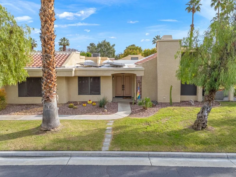 Quietly located at the back of the community and directly across from the pool, this well-appointed home offers privacy, convenience, and a desirable resort-style setting. Away from traffic and noise, yet close to shopping, dining, and everyday amenities with golf and tennis at your fingertips. This 3-bedroom + den, 2-bath residence features one of the largest floor plans in Cathedral Canyon Country Club. Vaulted ceilings and an open-concept living, dining, and bar area provide abundant natural light and a spacious feel. The updated kitchen includes beautiful cabinetry, stainless steel appliances, and a cozy dining nook.The primary suite offers vaulted ceilings, a walk-in closet, and a soaking tub. A guest bedroom with dual skylights connects to an updated bathroom with hallway access. Both bathrooms feature amazing tiled showers. Additional features include a separate laundry room, attached two-car garage, plantation shutters, updated plumbing fixtures, LED lighting, updated flooring, and newer HVAC system and water heater.The two private patios offer outdoor living, with the pool and spa just steps away. The perfect place to unwind with a glass of wine and enjoy the perfect sunny winter days.Community amenities include:18-hole championship golf course, multiple pools and spas, tennis and pickleball courts, clubhouse and social spaces, and gated access.HOA includes landscaping, exterior maintenance, controlled access, and cable TV/internet.Ideal for full-time living, seasonal use, weekend golfers or an easy lock-and-leave lifestyle. Schedule your private showing today and experience Palm Springs living at its best.