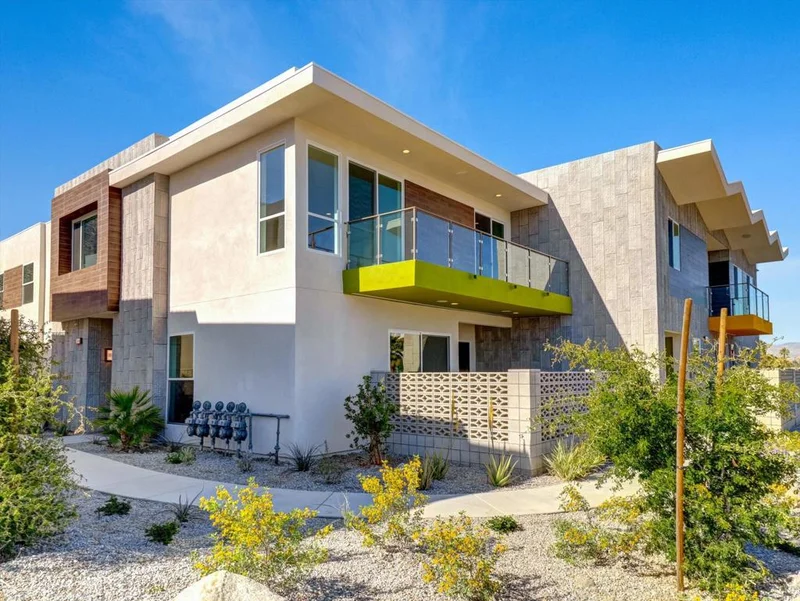 Welcome to Retro at E'lan Community and its offering of a mid-century modern townhome. This beautiful townhome features 2080 sqft of spacious living. This corner unit offers Views of North East Palm Springs from the living room, and upper bedrooms, and outside deck. Enter into 1st floor great room with open living space and kitchen. 2 Sliders to the spacious outdoor living areas. Built Cabinet matching refrigerator. Kitchen featuring S/S Appliances, plenty of counter space, and island covered with upgraded quartz with water fall finish at island. Head up the upgraded stairs to Primary bedroom and bath with conveniently spacious walk in closet and dual vanities. Head down the hall to cozy guest bedroom with full bathroom. The home has Gorgeous Designer Tile/Plank Flooring throughout. This energy efficient home comes with Solar that is paid for and not leased. Paved shared driveway entering into 2 car garage offers direct access to your home. If you have a dog, you can enjoy the dark park included at elan. If you enjoy the nightlife, you are within walking distance to downtown Palm Springs and all the restaurants and entertainment to keep you and your guest happy. Plenty of hiking trails starting with the Tahquitz Hiking Trail. The unit is part of a 5-unit building. Come be part of the story at Retro at E'lan Downtown Palm Springs! Some pictures are of the community pool and Common areas.
