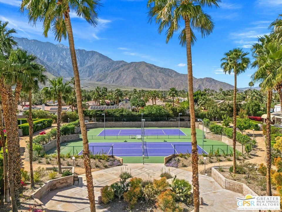 RARE to market. DESIGNER done. BIG views. The San Jacinto Mountains take center stage poolside at this reimagined residence within Sundance Resort, a low density collection of just 60 homes where every residence enjoys its own private pool and spa. Short Term Rental friendly on Fee land (you own it). Originally developed in the early 1980s by Clint Murchison Jr. as a private weekend retreat for players and their families, the setting today remains quietly special with expansive greenbelts, tennis, clubhouse, fitness spaces, and dog friendly walking paths, all thoughtfully arranged across two distinct enclaves for added privacy. This residence has been taken to the next level with a comprehensive renovation by its current owner, followed by a 2025 landscape refresh with all new lighting and irrigation across both front and rear patios. Inside, the living room makes an immediate impression with vaulted ceilings and a fireplace, while also being dialed in for entertaining with a built in bar, beverage cooler, and bar sink, all opening beautifully to the outdoors. The kitchen features custom European cabinetry finished in white melamine along with a premium appliance suite including KitchenAid Chef Series appliances and a Bosch dishwasher, while Hansgrohe fixtures bring a refined, modern edge throughout. A breakfast bar connects seamlessly with both indoor and outdoor dining areas, all positioned just off the kitchen for easy everyday living and entertaining. The design story continues into the baths with the same elevated cabinetry and finishes. The primary suite opens to the private saltwater pool with mountain views and features a double vanity and custom built ins. There is also a nicely integrated office alcove, adding flexibility for work or creative space. The guest bedroom is currently enjoyed as a den with its adjacent full bath. Fleetwood glass and slider doors enhance the seamless indoor outdoor flow and the atrium is a definite focal point, creating that desert lifestyle this home delivers so well. A private backyard gate opens directly to one of the community's expansive greenbelts, making outdoor living and dog walks especially enjoyable. HOA dues cover earthquake insurance, roofing, exterior maintenance and paint, water, waste, and landscaping, making for an easy lock and leave option in one of the desert's more unique communities.