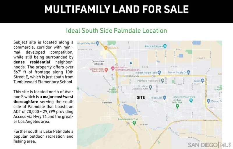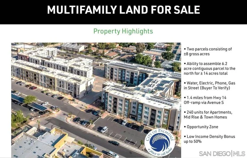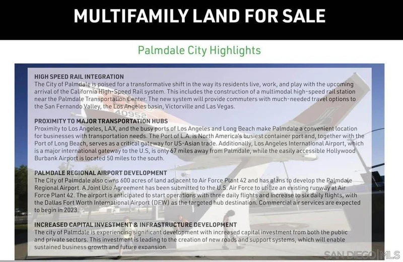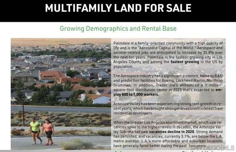 Prime Investment Opportunity in Palmdale, a thriving aerospace hub with a severe housing shortage and robust economic growth. No new apartment developments in over 30 years have created an extreme supply/demand imbalance, perfect for residential development. Key Highlights: High-Demand Market: Home to 20,000+ well-paid aerospace professionals from Northrop Grumman, Lockheed Martin, Boeing, General Atomics, and NASA at USAF Plant 42. Major Economic Drivers: Recent long-term defense contracts, including 80 Billion for B-21 bomber jets, Skunk Works AI and robotics programs, and Supersonic X-Plane development. Job Growth: Immediate technical and assembly jobs, with 2,500+ new positions driving 6,000+ support jobs in the local economy. Regional Commitment: Lockheed Martins new 208,000 SF advanced manufacturing facility (2022) underscores long-term investment in Palmdale. Capitalize on this rare opportunity to develop in a high-growth, underserved market with strong economic fundamentals. Perfect for residential or mixed-use projects.