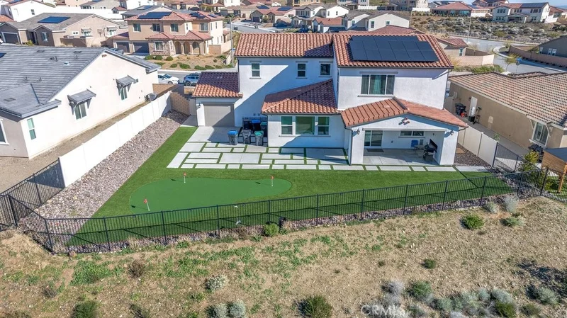 Welcome to this upgraded and energy efficient 2 story West Palmdale view home. This home features a 3 car pull through garage, OWNED solar, downstairs bedroom with private bath, and an open and expansive floorplan. From the entry, the formal living room, wide open kitchen with giant island and great views, large family room, downstairs bedroom with private bath plus a powder room, the first level is loaded with features. There's a great indoor/outdoor living area with fireplace, butler's pantry, and mudroom. The 3 car pull through garage is a great way to get bikes, cars, motorcycles or whatever you have into the back yard for detailing and/or storage. On the second level, there is a great currently used as an office/study area, and a gorgeous primary suite with a massive spa like bathroom, separate tub and shower, and roomy walk in closet. With 2 additional bedrooms upstairs plus the laundry room, you will have plenty of space for everyone. This home is just 5 years old, with recessed lighting, ceiling fans, and modern energy efficiency. Fully landscaped front and rear, there's also putting green to hone your skills in private. Located minutes from Highland High School, Palmdale Medical, Millen Intermediate, IDEA/Cottonwood Elementary, Marie Kerr Park, Trader Joe's and so much more. You don't even need to leave the neighborhood to access the great hiking and mountain biking trails that are right here! You're going to love everything this home has to offer.