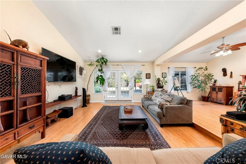 Nestled within the PRIME GATED COMMUNITY of California Chateau in West Palmdale, this beautifully upgraded home sits on an extra large lot exceeding 24,000 sq ft, offering plenty of space and privacy. Step inside to discover plantation shutters throughout, bamboo flooring, and a thoughtfully designed layout that flows beautifully for both everyday living and entertaining. The home offers a spacious living room, a formal dining area ideal for hosting, and a charming breakfast nook for casual meals. The kitchen is a standout, featuring quartz countertops, a built-in coffee bar, and ample workspace for cooking and gathering (chopping block not included in sale). Just beyond, the separate family room with a cozy fireplace is enhanced by French doors that open directly to the backyard, creating a seamless indoor-outdoor connection. The master suite is a true retreat, complete with a sitting area, a custom walk-in closet and a second closet for ample storage. The master bathroom boasts a custom vanity, a newly upgraded shower with gorgeous tile and a separate soaking tub. The second bathroom has been fully remodeled with a custom vanity and gorgeous new shower including new fixtures. A spacious laundry room with sink and built-in cabinetry adds everyday convenience. Step outside to an expansive covered patio spanning the entire length of the home, offering the perfect setting for entertaining, dining, and hosting memorable gatherings. The backyard is a gardener's dream, featuring mature fruit trees including apple, pomegranate, fig, Asian pear, pistachio, jojoba, sour cherry, and apricot. Additional highlights include a 3-car garage with epoxy flooring, newer AC and heating unit, and exterior upgrades such as fresh exterior paint completed approximately five years ago, a new porch cover, and a new garage door. Don't miss the opportunity to become a resident of this private gated community. Welcome Home.