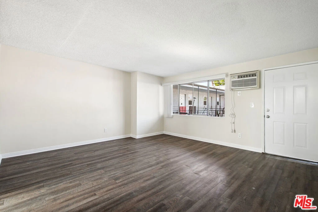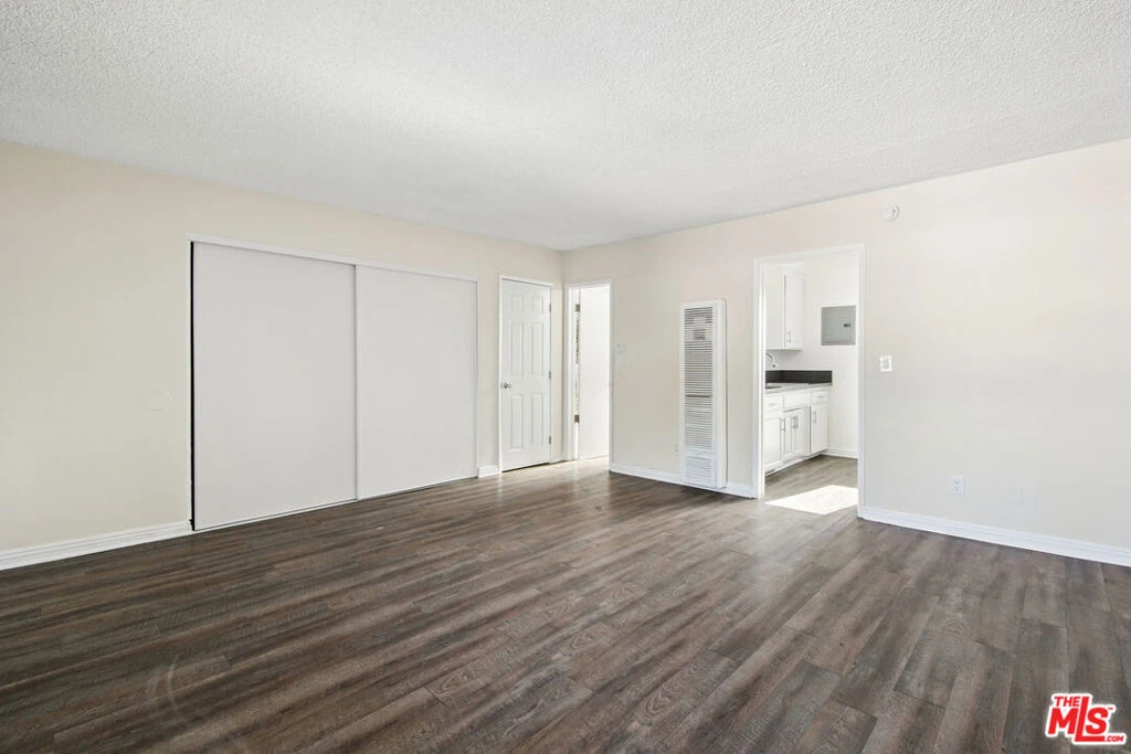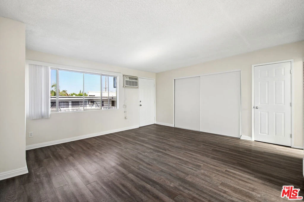 Spacious top-floor studio in the Panorama City area featuring an open layout, wood-style flooring, and excellent natural light. The unit offers a full kitchen with white cabinetry, gas stove, and refrigerator, along with ample closet space and additional in-unit storage. Bathroom includes a full tub and vanity storage. Wall AC unit included. One assigned parking space provided. On-site laundry and pool available. Water is included, tenant pays gas and electric. Pets allowed subject to owner approval. Conveniently located near shopping, dining, Panorama Mall, and major transit routes. Square footage is approximate and not verified.