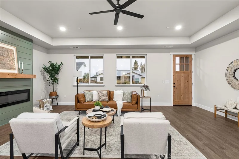 Modern design meets small-town charm here! This beautiful 3-bed, 2-bath home sits on one of Paradise’s most desirable, newly built streets—lined with gorgeous stick-built homes. Gone are the days of wondering what might be built next door; Madrone Way offers peace of mind and a true sense of community. If this home isn’t the one, come see what else is available on Madrone! Step inside and you’ll immediately be greeted by 9’ ceilings throughout, with 10’ tray ceilings in both the living room and the primary suite. The finishes set this home apart, with the green fireplace serving as an instant showstopper. The open-concept layout is perfect for entertaining, featuring a spacious kitchen with an L-shaped island and plenty of room for barstools—ideal for gatherings and everyday living. This split floor plan places two bedrooms, a full bath, and the laundry room on one side, while the primary suite enjoys its own private retreat on the other. The primary bathroom feels like a spa getaway, showcasing a striking wet room with a tile shower and soaking tub, all enclosed in glass for a sleek, modern touch. From the primary suite and back patio, enjoy beautiful sunsets that fill the sky each evening! Outside, you’ll love the fully fenced backyard, perfect for pets, play, and privacy. The location is unbeatable—tucked on the west side of town with a short drive to beloved Bille Park and easy access to Skyway, making it simple to reach anywhere in Paradise or beyond in minutes. Built by American Dream Construction, a trusted local builder known for quality and craftsmanship, this home includes an extra 6-months to the standard 12-month fit & finish warranty for added peace of mind. Plus, a brand-new, OWNED solar system (installed during escrow) for added efficiency and savings. For peace of mind, American Dream is one of the only builders in Paradise going above and beyond current wildfire safety standards. Each home is fully wildfire-prepared, featuring 5 feet of defensible space, Class A fire-rated roofing, ember-resistant Vulcan vents, and non-combustible gutter systems and downspouts—offering both beauty and resilience in one exceptional package. With great curb appeal, landscaping, fencing, a two-car garage, and thoughtful design throughout, 717 Madrone Way is a home you’ll love coming back to every day. Not to mention, SageSure quoted this property under $1900/yr - NO CA FAIR PLAN NEEDED!