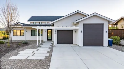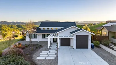 Soaring two-story cathedral ceilings with artistic beams, panoramic coastal mountain views, and protected open space privacy define this exceptional custom residence inside the gates of Heritage Ranch at Lake Nacimiento. Designed to capture natural light and surrounding landscapes, the home blends modern architecture, craftsmanship, and relaxed lake living. Inside, the open great room floor plan seamlessly connects the living, dining, and kitchen spaces, creating an ideal setting for entertaining while framing the surrounding hills through expansive glass doors. The chef’s kitchen offers both style and performance with a commercial-grade six-burner Wolf range, gorgeous white Corian countertops, a generous center island, and custom soft-close cabinetry. Built-in cabinetry throughout home and thoughtful storage add both elegance and functionality, including a beautifully integrated serving and display area within the main living space. The spacious primary suite serves as a private retreat featuring a dressing room with extensive cabinetry and a spa-inspired bathroom designed for relaxation. Three additional bedrooms, one being an ensuite, provide flexibility for guests, family, or office space. A unique courtyard-oriented design allows the main living areas and bedrooms to open toward a private outdoor entertaining space, creating seamless indoor-outdoor living. Positioned with protected open space along both the side and rear of the home, the property enjoys exceptional privacy along with sweeping coastal mountain views and peaceful meadow landscapes where deer and native wildlife are frequent visitors. Additional highlights include an oversized laundry room with sink and extensive cabinetry, a large two-car garage designed to accommodate a pontoon boat, and low-maintenance landscaping with artificial turf. Located within the gated community of Heritage Ranch, residents enjoy a private marina and boat launch, pools, pickleball and tennis courts, parks, trails, and year-round community events—all just a golf-cart ride away. Just outside the gates we have restaurants, gym, grocery store, hair salon and K-8th grade school.