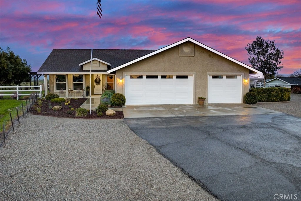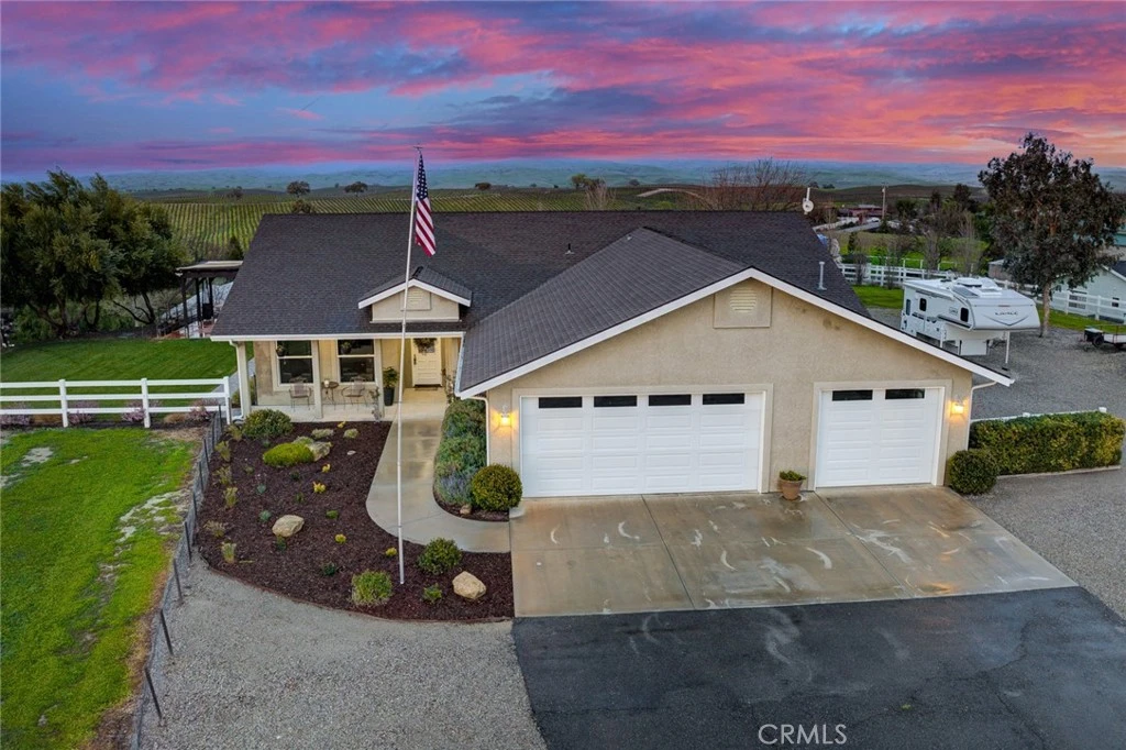 Built in 2005, this beautifully maintained 4BD/2BA home sits on 2 usable, manicured acres with a dedicated pasture in the rolling hills of Paso Robles, offering sweeping 360-degree views of vineyards, countryside, and stunning sunsets. An electric gate opens to a long-paved driveway and fully fenced grounds featuring white vinyl three-rail fencing with additional snake fencing — ideal for animals and country living. The sun-filled interior showcases high 9-foot ceilings and expansive windows that invite abundant natural light throughout. The kitchen features granite countertops, stainless steel appliances, and generous storage, along with indoor laundry and an oversized 3-car garage. The living room fireplace creates a warm focal point, while the primary suite offers a double-sided fireplace shared with the en-suite bath, complete with a sunken soaking tub and spacious shower. A bonus room provides additional flexible living space. Outdoor amenities include a full outdoor kitchen, above-ground pool, producing olive trees, horse stalls, chicken coop, a thoughtfully built treehouse, owned soft water and reverse osmosis systems, plus a full RV hookup with 50 AMP service and clean-out. The pasture and fenced acreage make this property perfectly suited for horses, livestock, or simply enjoying wide-open space. Refined wine country living with privacy, usability, and breathtaking vineyard views. Too many amenities to list — this incredible property must be seen to be fully appreciated. All information deemed reliable but not guaranteed. Buyer to verify.