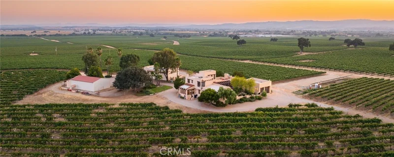 Wine country estate set across 52± acres in the heart of the Paso Robles AVA, commanding unobstructed views over 28.5± planted acres of Cabernet Sauvignon and expansive sunset horizons. The 3,869± sq. ft. custom residence is thoughtfully positioned to capture the surrounding vineyard vistas from nearly every room. A dramatic entry introduces Travertine flooring, exposed beams, and walls of windows that frame the landscape beyond. The open-concept living and dining areas transition seamlessly into a beautifully appointed kitchen designed for entertaining, featuring custom native black walnut cabinetry, a Viking 6-burner range with double ovens, under-counter microwave, Sub-Zero refrigerator, granite island, and quartz countertops. A casual dining area offers direct patio access, blending indoor and outdoor living. The primary suite serves as a refined retreat with recently updated Travertine flooring, new carpet and lighting, radiant heated floors, soaking tub, custom vanity, and frameless glass shower. Additional interior highlights include a dedicated office, art gallery hallway, wine cellar, and private outdoor patio with rooftop seating designed to embrace the panoramic setting. Equestrian amenities include a horse barn with two 12x12 stalls, attached one-bedroom casita suite, and approximately 4± acres of fenced horse pastures. A separate shop building with roll-up doors provides additional functionality for ranch operations. The property is supported by both agricultural and domestic wells, a solar array powering the vineyard and ranch improvements, and solar-operated entry gates. Enrolled in the Williamson Act, the estate benefits from reduced property taxes. Surrounded in every direction by vineyard rows and defined by architectural character, this Paso Robles estate represents the rare convergence of wine country production, equestrian infrastructure, and elevated living.