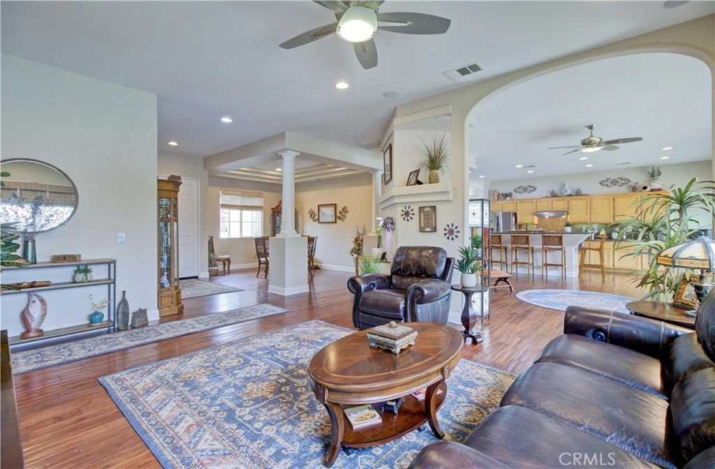 Welcome to this beautiful One-of-a-Kind RANCH ESTATE located in the highly desired GAVILAN HILLS community near LAKE MATHEWS. The home is on a 1.8 acre fully usable PREMIUM VIEW LOT. This entertainers delight has breathtaking views of the surrounding hills and pool, and is situated to give you plenty of privacy. There are multiple entertainment and seating areas to enjoy those sunsets and views, with lighting to continue your enjoyment throughout the evenings. In addition to the large POOL with waterfall and in-ground SPA, there is an enormous FULL KITCHEN CABANA, a CUSTOM SUNKEN STONE OUTDOOR SHOWER, FIRE PIT, and a large GAZEBO area with electricity nearby. There are 4 Avocado, multiple Citrus & Fruit Trees and lush Palm Trees, with water plumbed throughout the property for your convenience. For you horse lovers, the property has a 2-Stall CASTLEBROOK BARN, with tack room, wash rack and turn-outs. In addition to the three car garage, there is a LARGE drywalled WORKSHOP with an additional storage area. A white split rail fence encircles the property with an electric gate at the entrance. There is ample room for your RV, BOAT, and TOYS on this pristine property. The spacious one story floorplan has 10' CEILINGS with walnut hardwood flooring in the main living areas, half bath & 4th bedroom/office. There is a formal dining room with coffered ceilings, and a wood burning FIREPLACE in the den and casual dining area that opens to the gourmet kitchen. The kitchen has granite countertops and a built-in ReadyHot Dispenser at the sink. The spacious primary bedroom has views of the pool and hills as well, and opens up to the pool area. The upgraded bathroom has a jet soaking tub with separate shower, and an enormous closet with top of the line dark wood buildouts.The 24 TESLA solar panels and inverter were recently upgraded and replaced in 2025, ensuring low electric bills. (Tesla Power Purchase Agreement- 10 years left of agreement. See attached information in the supplements.) This home is in TURN-KEY condition with new paint and upgrades everywhere you look. There is access to the 20+ MILES of GROOMED RIDING TRAILS and the COMMUNITY EQUESTRIAN CENTER with a lighted riding area, round pens and covered stall. HARTFORD SPRINGS RESERVE is in this GAVILAN HILLS community, as it is a wonderful 325 acre park that has several trails, including the WILDFLOWER TRAIL. Check out the waterfall and trails in the nearby BLM land as well!