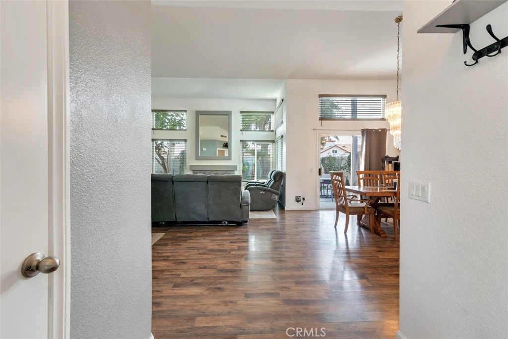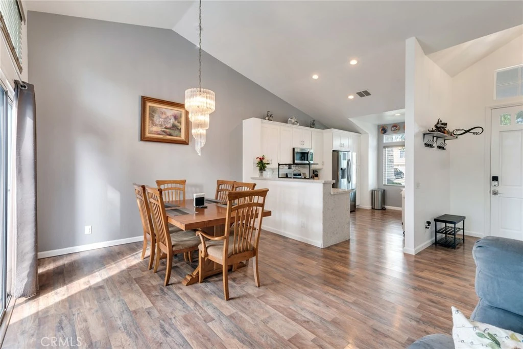 Welcome to this beautifully updated single-story home featuring soaring vaulted ceilings and an open, light-filled floor plan. This 3-bedroom, 2-bath residence offers laminate wood flooring throughout the main living areas and a spacious 2-car garage with direct access. The remodeled kitchen features white cabinetry, quartz countertops, subway tile backsplash, stainless steel appliances, recessed lighting, and a breakfast bar that opens to the dining and living areas, ideal for everyday living and entertaining. The inviting living room showcases dramatic ceiling height, clerestory windows, and a stylish fireplace. The spacious primary suite includes direct backyard access through new sliding doors and an upgraded en-suite bath with dual vanities and a beautifully tiled walk-in shower. Extensive recent upgrades include all new interior and exterior paint, new dual-pane windows throughout, new sliding glass doors, brand new HVAC with ducting and professionally installed LeafFilter gutters surrounding the home with a 50-year warranty. Step outside to an expansive, park-like backyard with mature trees, lush grass, patio space, and vinyl fencing, offering privacy and plenty of room to entertain or relax. With low taxes and no HOA or Mello-Roos, this move-in ready home is a rare opportunity