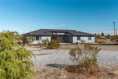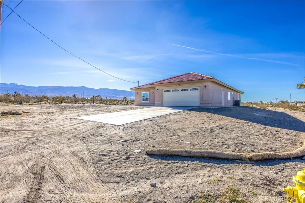Modern new construction home in Phelan, CA on approximately 1.9 acres with panoramic mountain views toward Mountain High Resort. This single-story residence offers 4 bedrooms and 2 full bathrooms with a double-sink vanity in the primary bathroom. The open-concept layout features a vaulted living room ceiling, white marble-style flooring, and recessed lighting throughout. Smart Wi-Fi–enabled chandelier ceiling fans provide music capability in all bedrooms. The kitchen showcases custom cabinetry, a full-height cabinet pantry, and a large island with quartz countertops featuring a marble-like finish. Home is equipped for either all-electric or propane appliances. Bathrooms include state-of-the-art LED color-changing light-up faucets, a unique modern upgrade. Additional features include custom window shutters, a front bedroom with a built-in cabinet, tankless water heater, keyless entry front door, and owned solar panels. The fully finished and insulated garage includes an insulated garage door. Exterior highlights feature a tile roof, flood lighting, and a cement walkway surrounding the home to help prevent discoloration and enhance low maintenance. Enjoy the covered attached patio with recessed lighting and hammock hooks. Property includes a 1500-gallon concrete septic tank. A rare opportunity to own a brand-new, energy-efficient home with smart features, scenic views, and space to enjoy High Desert living.