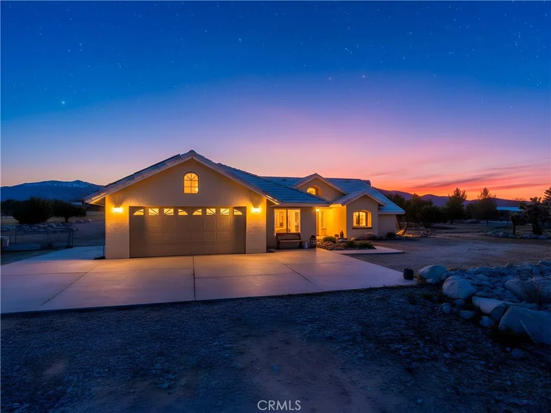 A true gem of a home is awaiting you here in the serene town of Pinon Hills. Situated less than a mile from paved roads with well maintained access to a 2.05 acre property. The 360 degree mountainous views will take your breath away. Coming home to a full fenced property with an electric entrance gate to welcome you to your beautiful sanctuary of a home. Dual AC Units keep this desert home comfortable year round. This 2,818 sq ft home with 4 bedrooms and 2 baths is a turnkey home that has been updated with magnificent touches. New life proof vinyl flooring has been installed throughout the home. New base boards fully finished to complete the home upgrade. Light fixtures have been updated though the home to create a modern design, you will be able to boast about. As you enter the home the large entry way opens up to a dining area and large open floorplan. The Family Room has sliding doors and windows throughout to enjoy the views of the Mountains. The peninsula style fireplace separates the rooms to provide heat to the center of the home. The kitchen and living room are adjoined for a great entertaining space. A breakfast nook looks out to the backyard. The covered back patio is great for barbecuing and dining outdoors. 2 Bedrooms are standard size with sliding door closets. An extra large 3rd bedroom with double doors can also be used as a home office overlooking the front entrance and view of the high desert. The primary bedroom is on its independent wing of the house and has access to the backyard via sliding doors. The massive walk in closet will satisfy your wardrobe needs. The home is equipped to protect against power outages with 2 Tesla Battery Backups. 45 in total solar panels charge the home fully and are on a Transferable Lease with SunRun. Enjoy the perks of future proof rising bills by leasing your own solar equipment. The use of electric fireplaces to minimize propane consumption will reduce the cost of filling the propane tank. The 2 car garage space has an additional workshop space and a utility room with counter top and sink. Plenty of additional storage space. EV Charger Ready for your electric or hybrid vehicle. This massive lot on flat land makes building flexible. The chicken coop is next to new and include hens that lay perfect eggs.
