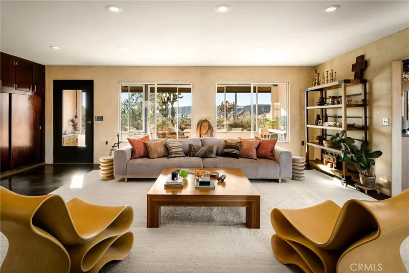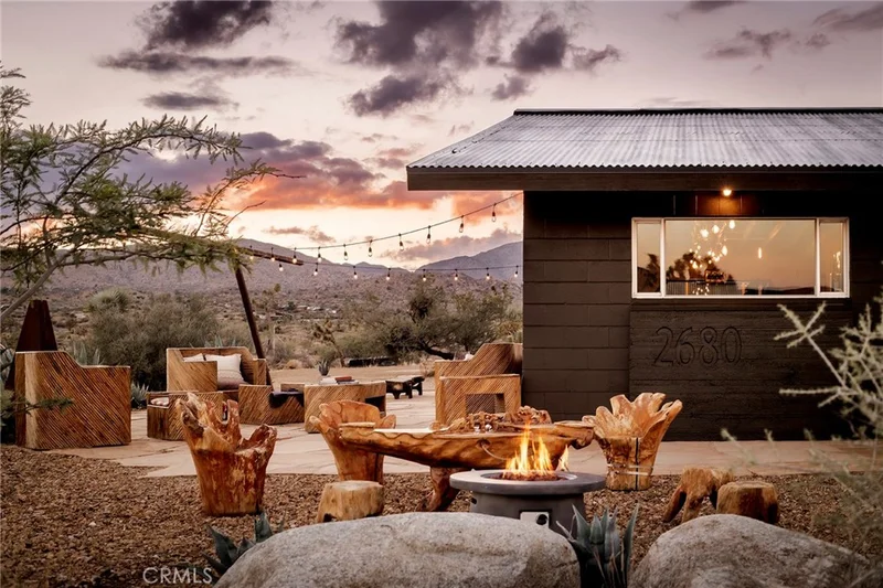 With breathtaking views spanning from the lava buttes of the Sand to Snow National Monument to ancient boulders and the distant peaks of Big Bear and Mount San Jacinto, this extraordinary 40-acre ranch offers a rare combination of natural beauty, privacy, and outdoor adventure. With direct access to miles of trails perfect for off-roading and horseback riding, the property is just minutes from Pappy & Harriet’s, Joshua Tree National Park, and the heart of Pioneertown. Every room captures a unique desert or mountain view, creating an inspiring indoor-outdoor connection throughout. Currently one year into the subdivision process, the parcel is being divided into four legal opportunities: a 20-acre main compound featuring the primary residence, detached 2.5-car garage with office, original 1932 homestead cabin, and stables; plus one 6-acre parcel and two 7-acre parcels. Easements are in place, and nearby electric poles allow for future utility access, making this both a lifestyle ranch and a long-term investment. The 1,527 sq ft main residence offers 2 bedrooms, 1 bathroom, and a bonus office. Venetian plaster walls, a newly remodeled bath with Italian and Moroccan finishes, and a chef’s kitchen with butcher block island and KitchenAid appliances blend rustic character with modern comfort. Additional features include a wood-burning fireplace with NuTone blowers and a paid-for solar system while remaining on-grid. The original 1932 homestead cabin (313 sq ft) is a fully equipped 1-bedroom, 1-bath retreat with a kitchen, soaking tub, and dipping pool—ideal for guests or additional income. Outdoor amenities include a cowboy hot tub, airplane-engine pool, horse corral, chicken coop with laying hens, playhouse, bike track, and garden room. A rare opportunity to own a working ranch, private retreat, and subdividable investment in one of Pioneertown’s most iconic settings.
