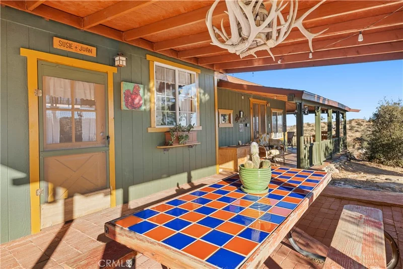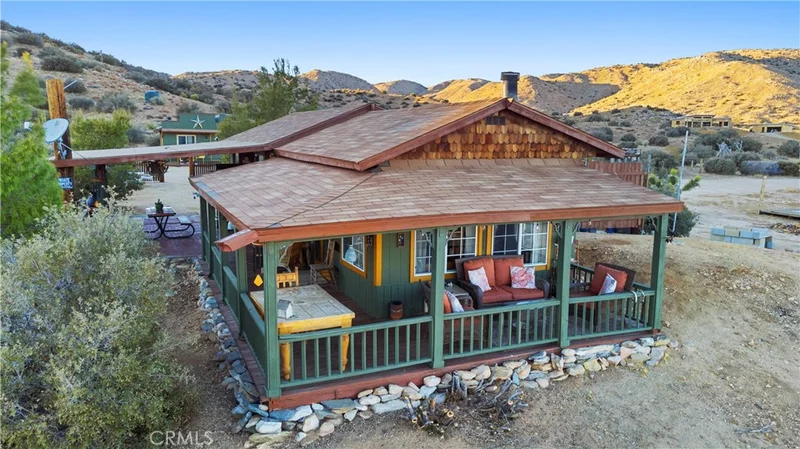 Nestled in the serene Rimrock area of Pioneertown, this charming off-grid cabin offers a rare opportunity for those seeking a peaceful, sustainable lifestyle. This 1-bedroom, 1-bathroom home, zoned single family residence, is situated on 2.5 acres of land, sale also includes the adjoining 2.5-acre parcel to the north—making 5 acres total. Step inside and be greeted by a spacious living room that features a mid-century wood-burning stove and large windows, framing breathtaking desert views. The cabin is equipped with solar-powered electricity, and heating, cooking, and refrigeration are all powered by propane, ensuring comfort off the grid. Property has recently been repainted, solar system has new batteries and has new generator. Water is hauled to the property. Enjoy the desert landscape from the wraparound covered porch, perfect for relaxing or entertaining guests. Speaking of guests, the property includes two detached bungalows (both with new flooring, not pictured) ideal for overnight visitors—complete with a separate bathhouse (recently painted, new flooring and new toilet). With approximately 820 square feet of living space, this cabin offers a perfect balance of privacy, rustic charm and modern convenience. Experience all the high desert has to offer while living just down the road from famous Pappy and Harriets, Red Dog Saloon and stellar hiking trails through the Pioneertown Preserve. Whether you're looking for a weekend getaway or a full-time retreat, this unique property in Pioneertown is the ideal choice. Buyer to investigate all permitting, square footage and zoning.