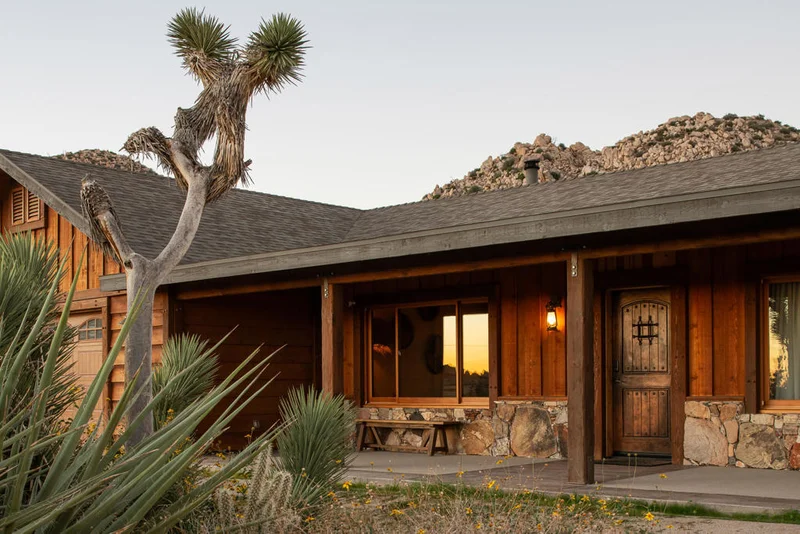 A private desert hideaway in Pioneertown set on just under 2.5 acres, offering wide open views, modern finishes, and a valuable second parcel for added space, privacy, or future potential.Designed with a refined blend of rustic and contemporary elements, the home features soaring wood ceilings, large windows that frame the surrounding mountains, and a spacious interior layout centered around a striking wood-burning fireplace. The kitchen includes elevated materials, custom wood cabinetry, and an easy flow into the dining and living areas, creating a comfortable setting for everyday living and gatherings.The home offers three generous bedrooms and three baths, including a well appointed primary suite with a walk in shower, dedicated vanity area, and a soaking tub oriented toward the desert landscape. A bright flex room adds a dedicated space for work, creativity, or quiet retreat, and the large garage provides ample storage or workshop potential.Outdoor areas include a wood deck, cowboy pool, spa, BBQ and dining area, and multiple lounge spaces for sunrise, sunset, and stargazing. The combined parcels create a rare sense of openness while still offering defined outdoor living spaces throughout the property.Located within walking distance to downtown Pioneertown, Red Dog, and Pappy and Harriet's, and a short drive to Joshua Tree National Park and the shops and restaurants of the High Desert.A standout desert property with modern construction, elevated materials, generous interior volume, and a valuable bonus parcel, ideal as a full time residence, private retreat, or an incredible opportunity to create a premium short term rental.