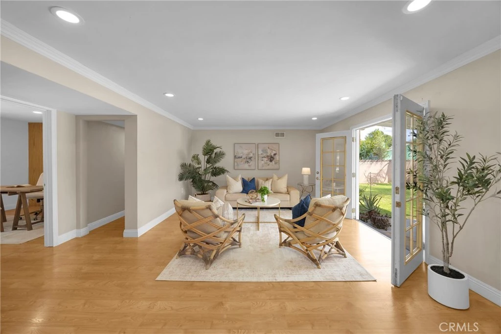 Tucked away on a quiet cul-de-sac bordering Fullerton, this inviting single-story home offers 4 bedrooms, 1,678 square feet of living space, and a generous 7,938 square foot flat lot. Located just minutes from California State University, Fullerton, with easy access to major freeways, shopping, and dining, the home blends everyday convenience with a peaceful residential setting. Filled with natural light, the home features a thoughtful split-bedroom layout with a private primary suite set apart from the additional bedrooms. The fourth bedroom, currently used as an office, includes recessed lighting and pleasant neighborhood views. The heart of the home offers spacious kitchen and dining areas, complemented by a charming original brick fireplace. The family room opens seamlessly to the backyard through double French doors, creating an ideal indoor-outdoor flow for entertaining or relaxing. Additional highlights include solar panels, a water softener, newer water heater, and updated AC and furnace. A separate laundry room with side yard access provides flexibility, while the side yard itself offers potential for additional outdoor living space. The backyard is neatly maintained for easy upkeep. Offering a combination of comfort, location, and opportunity, this home is ready to be enjoyed.